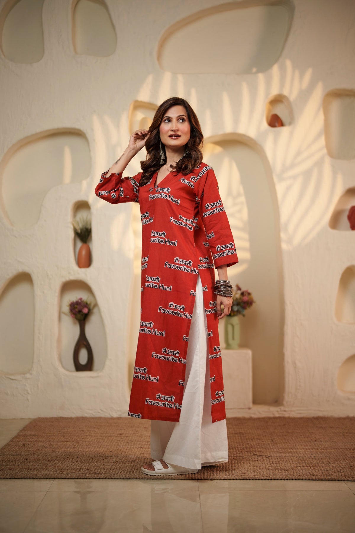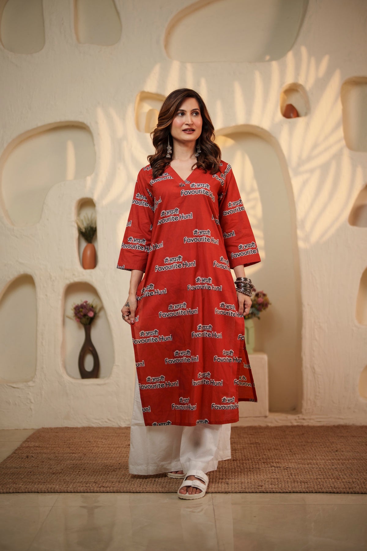 Pure cotton kurta is made straight cut. It has caption on it crafted in screen print. It is soft and comfortable, can be teamed up with variety of bottoms.