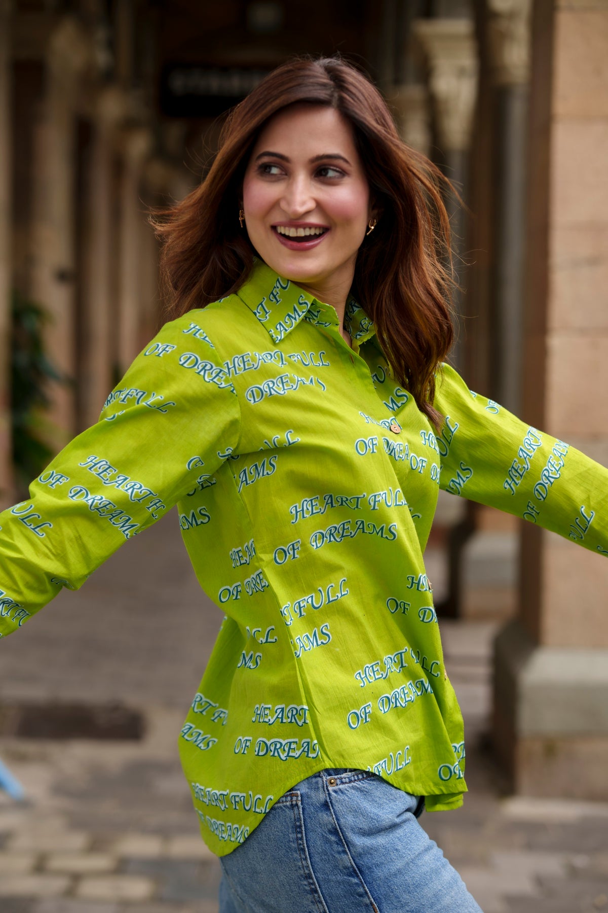 Pure cotton shirt is made in straight fit. It is made with caption in screen print. Sleeves are full with buttons.