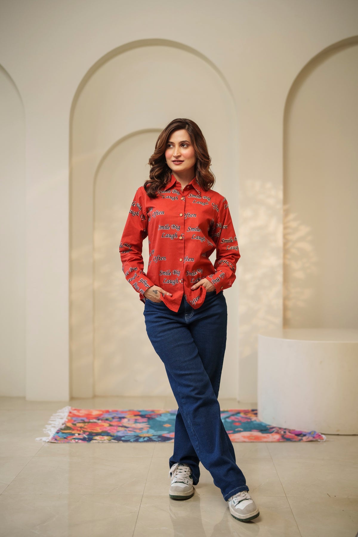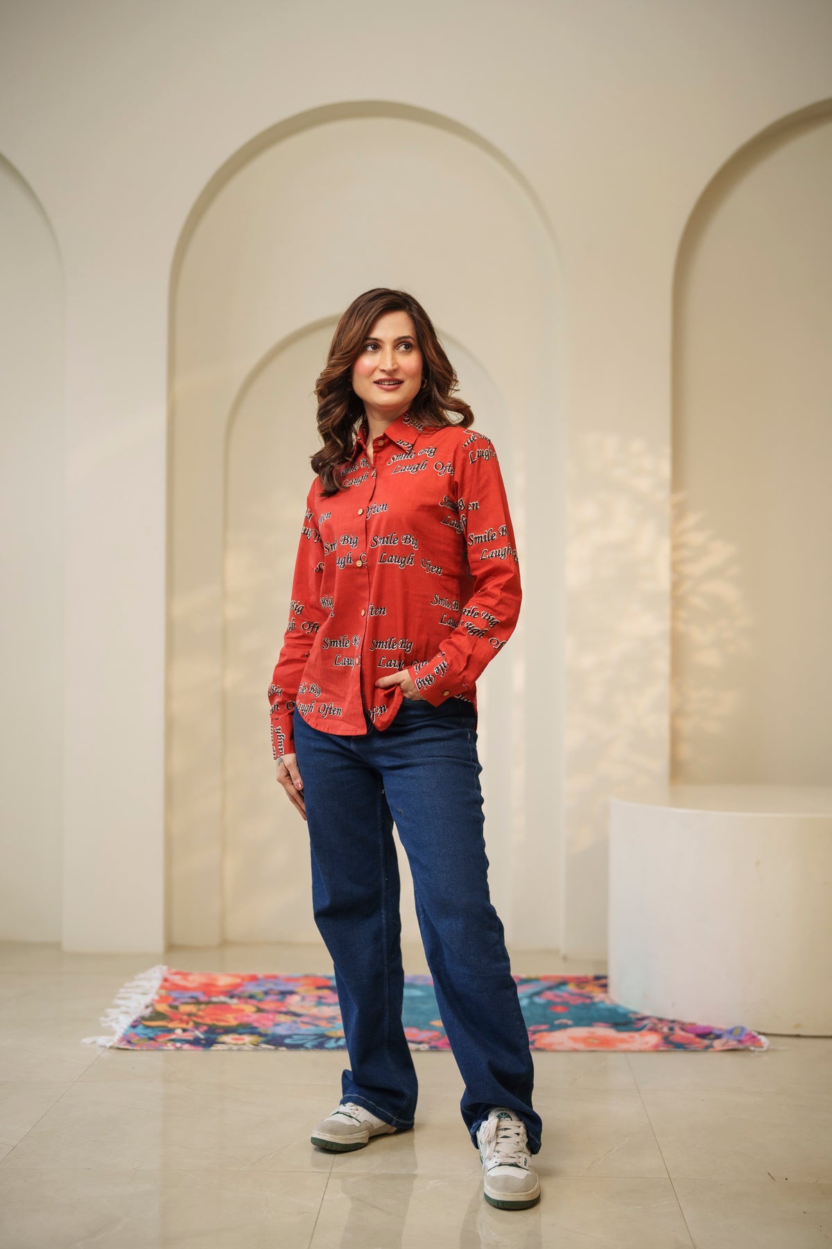 Red "smile big laugh often" cotton shirt