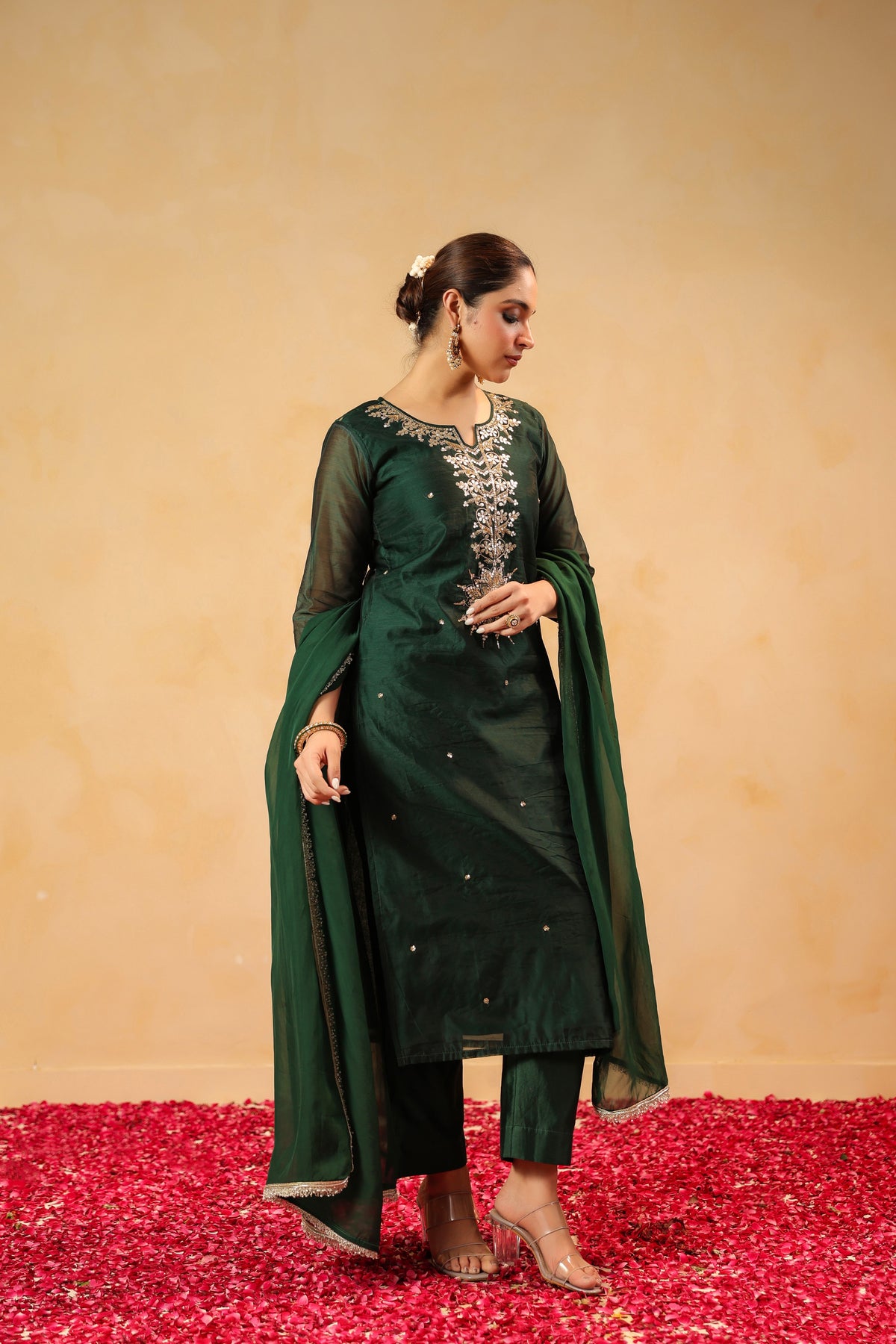 The kurta set is crafted in cotton chanderi which has beautiful gota patti hand embroidery near neckline. Kurta has soft lining. Pants are in soft cotton chanderi and straight cut. It has side pockets with front drawstrings. Dupatta is in organza with lace all across near borders.