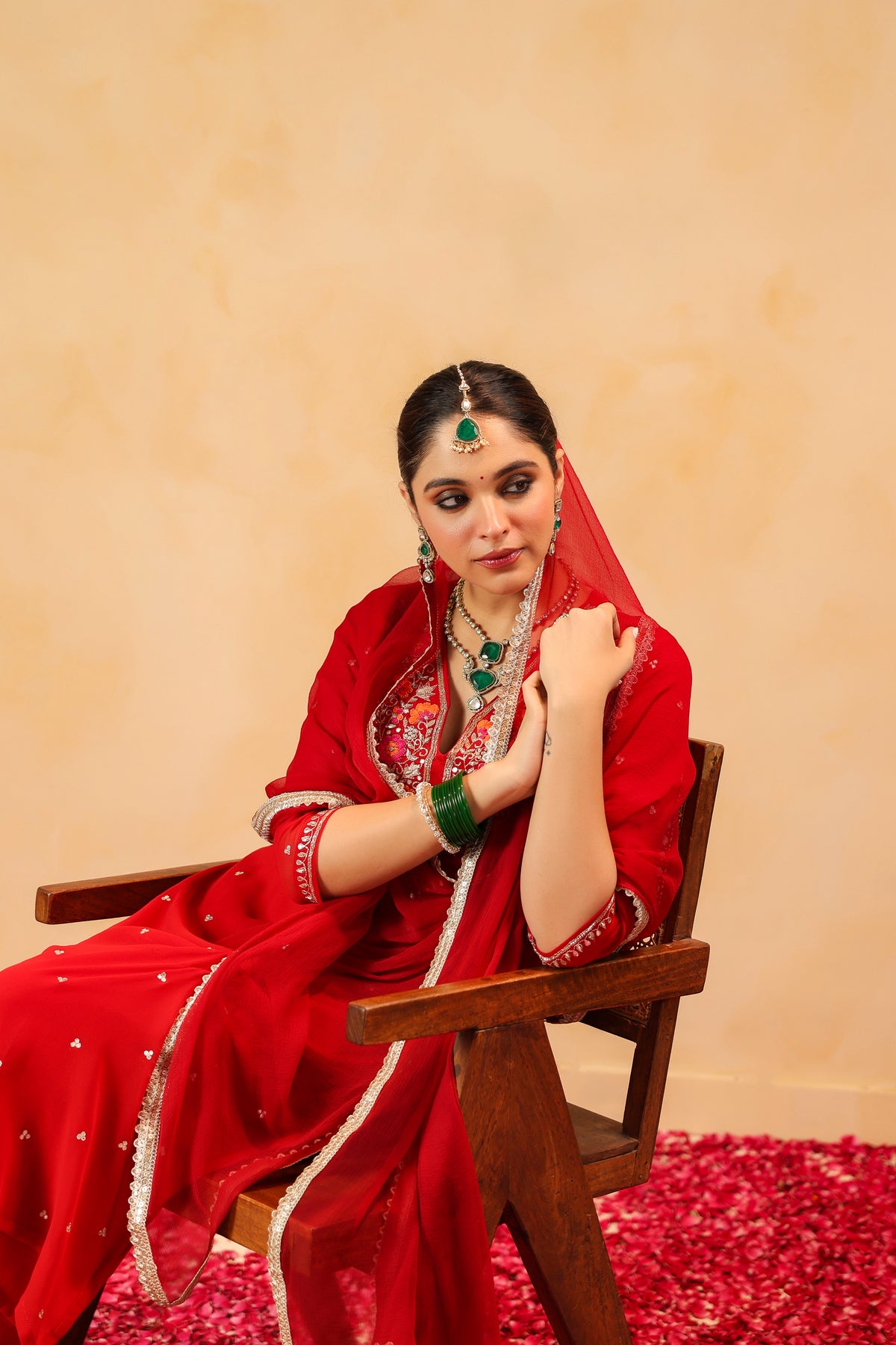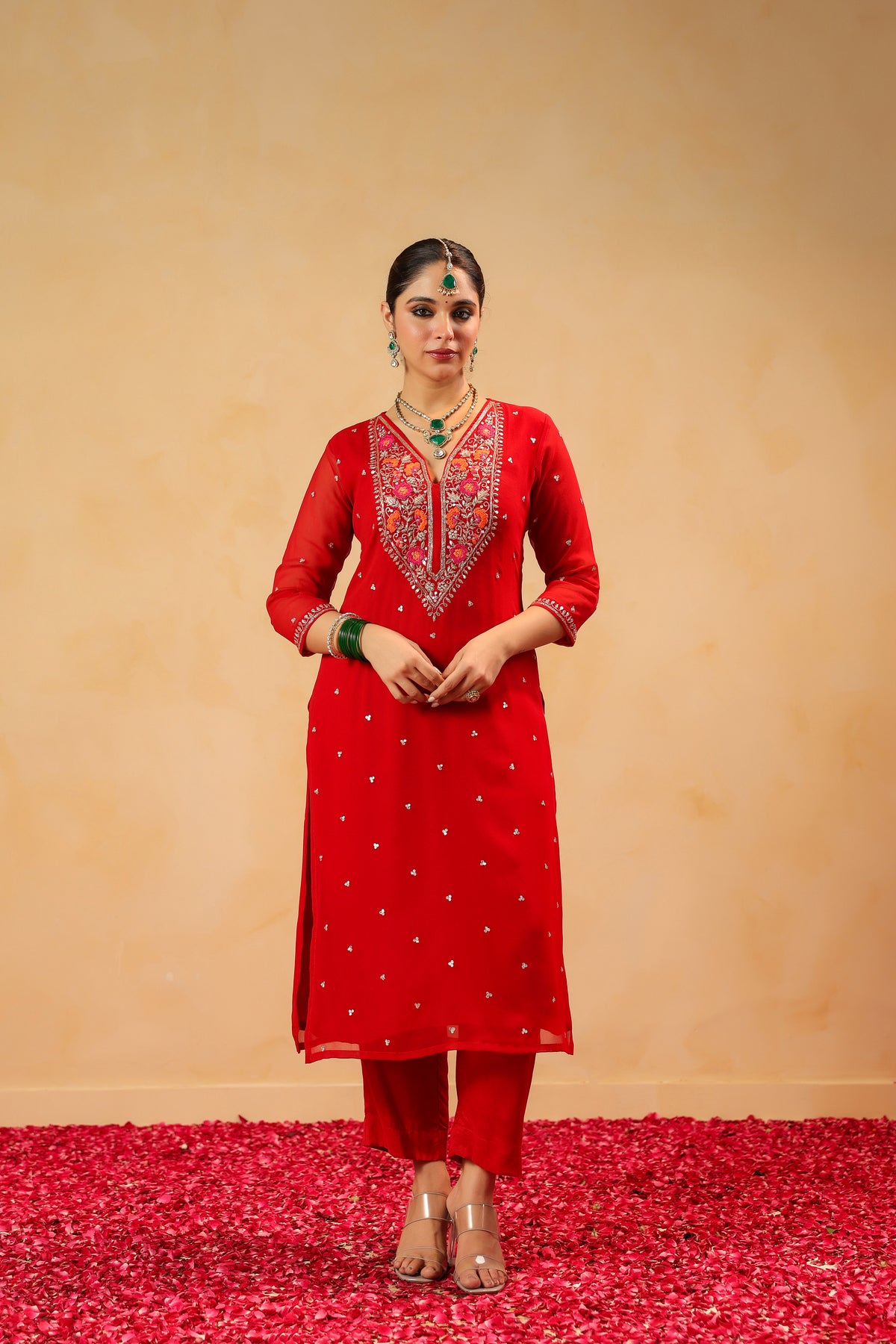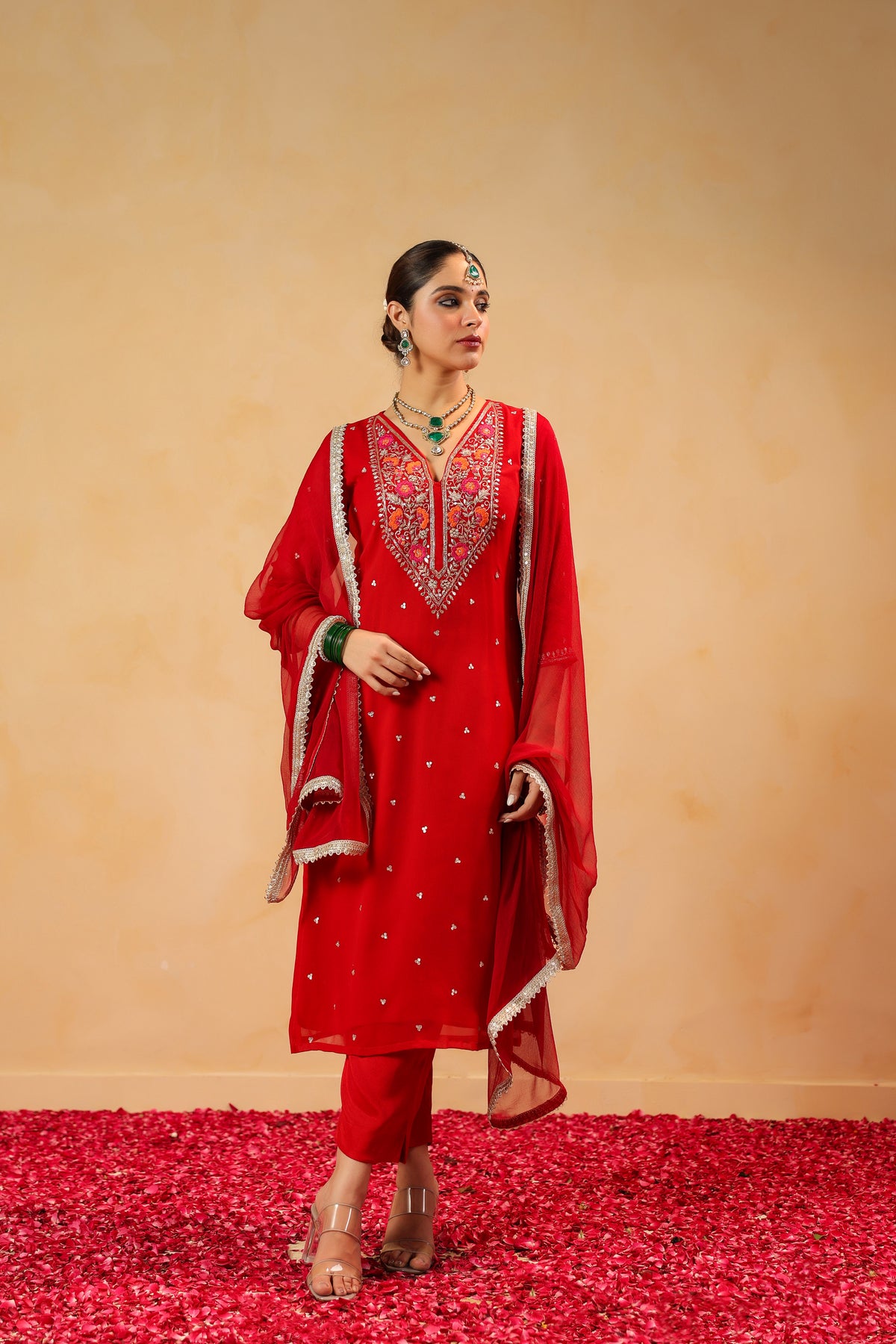 This beautiful suit set is crafted on viscose georgette. It has delicate hand embroidery of gota patti and thread embroidery handwork in front of kurta and sleeves. Kurta has soft lining. Pants are in soft shantoon, cut in straight. It has pockets on both sides with front draw strings. Dupatta is in soft chiffon with laces all across borders.