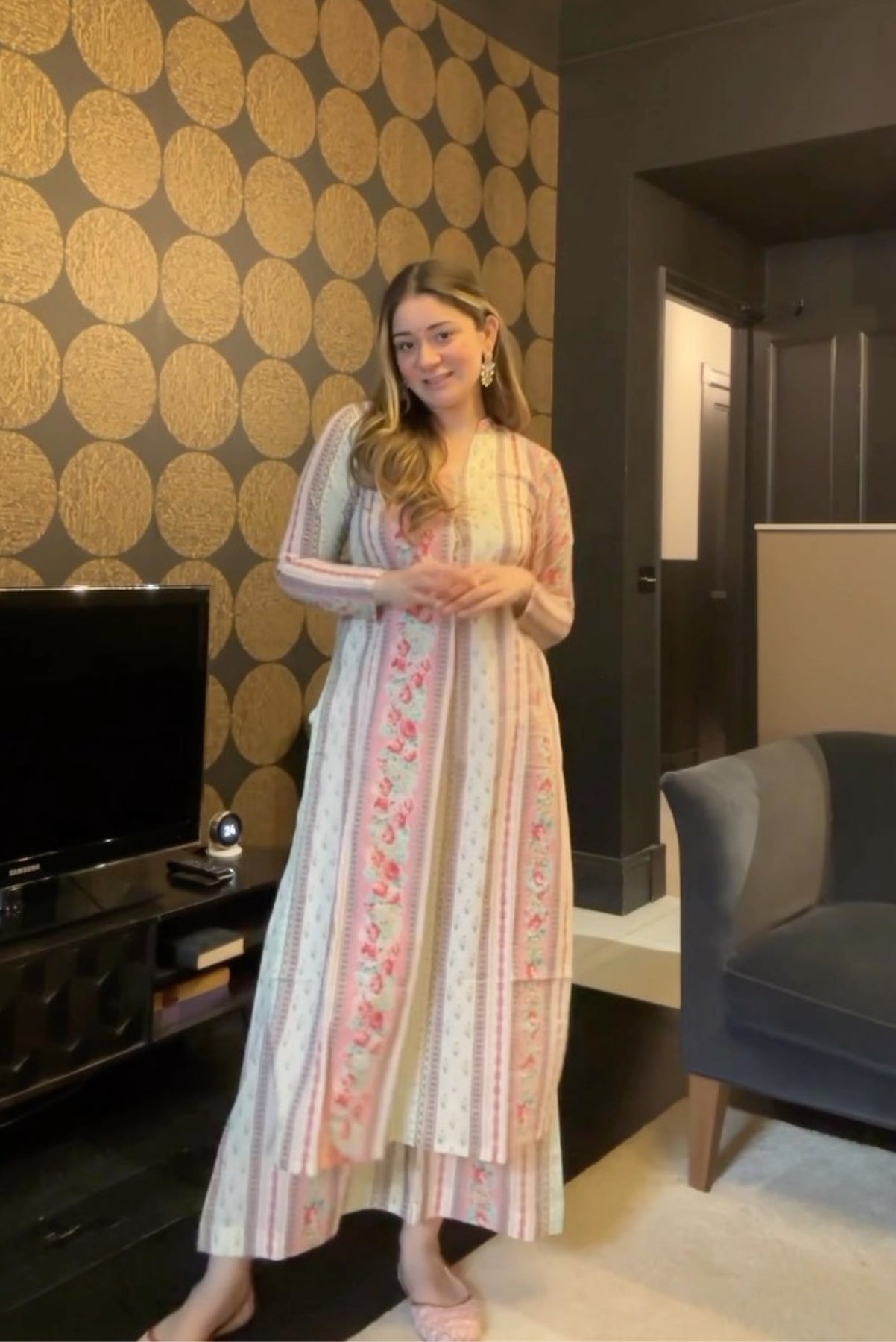 This kurta set is made in screen print placement technique. It has florals and abstract print all over it. Kurta is straight loose fir with full sleeves. Palazzo is wide leg with side pockets.
