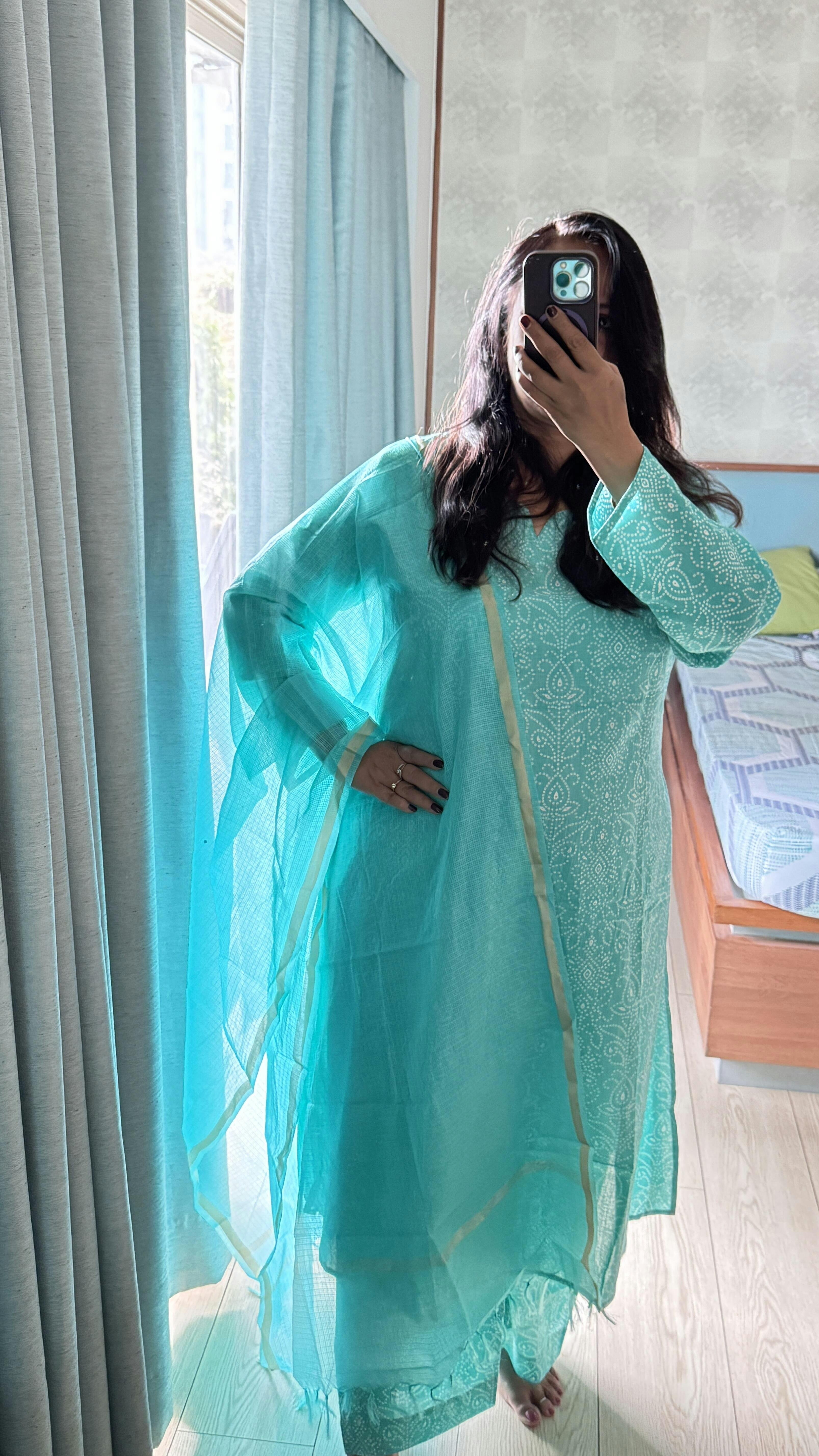 Firozi bandhej suit set is stiched in A-line with pallazzo. This beautiful suit comes with soft kota doria dupatta. Pallazzo has side pockets and front drawstrings. Kurta and bottom have intricate bandhej print all over it.