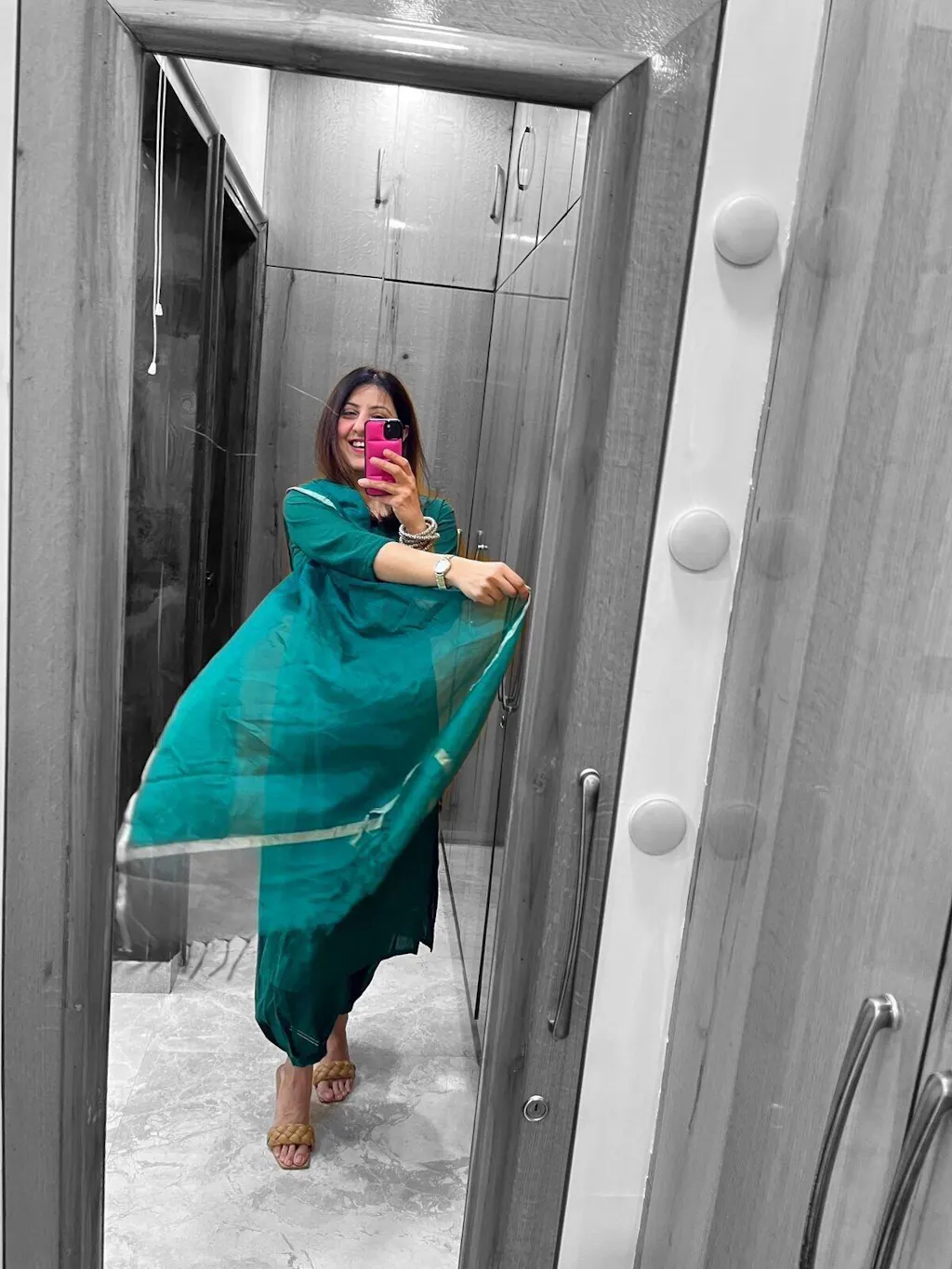 Pure cotton suit set in teal color with pleated pants. Dupatta in soft Kota Doria with gold Zari print at the borders. This beautiful design is crafted in straight cut loose fit.