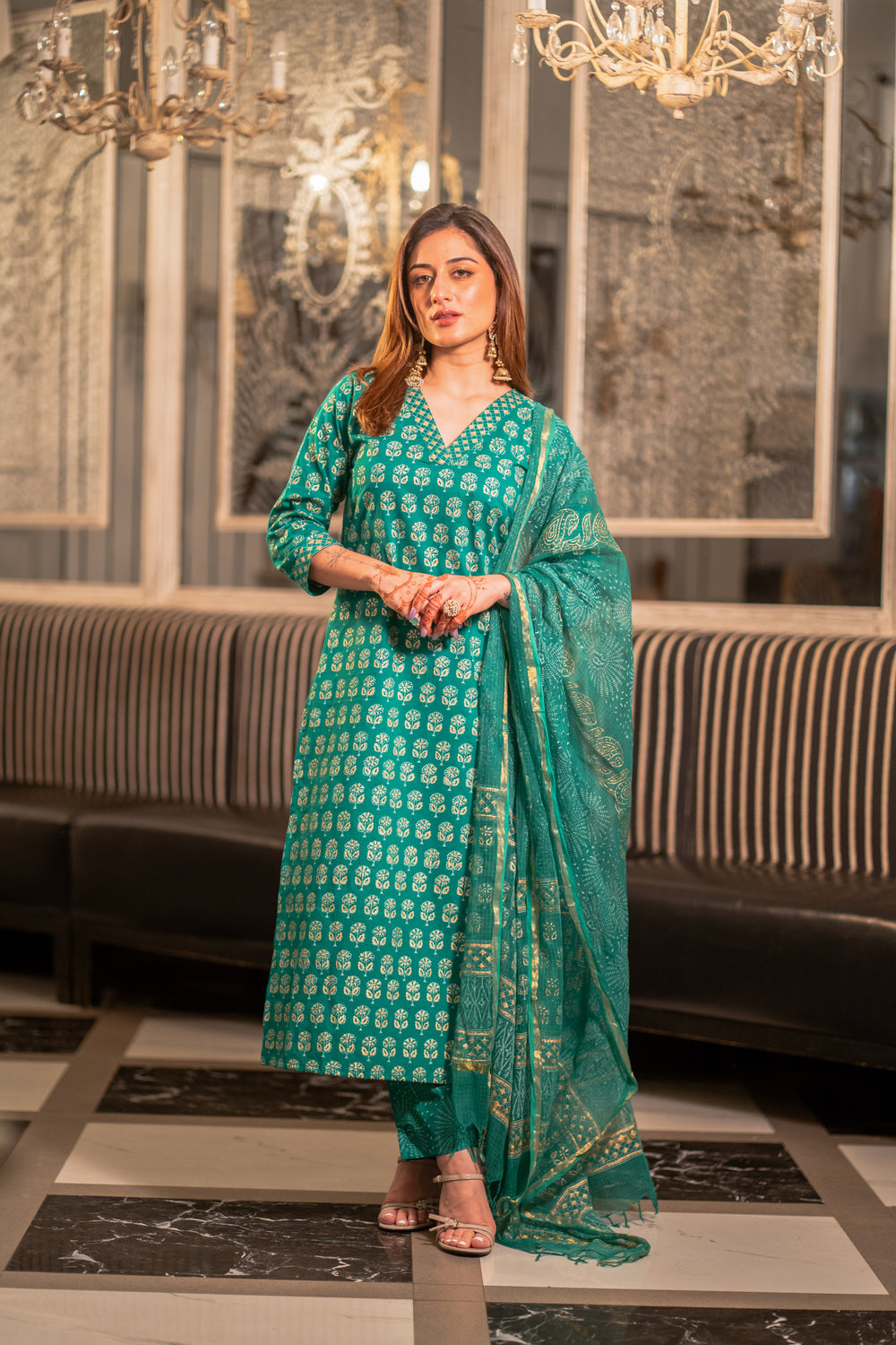 This suit set has traditional ethnic motifs print all over it. It comes with soft kota doria dupatta with print all over it. The entire print technique used is handblock. Bottom is made in pants with side pockets.