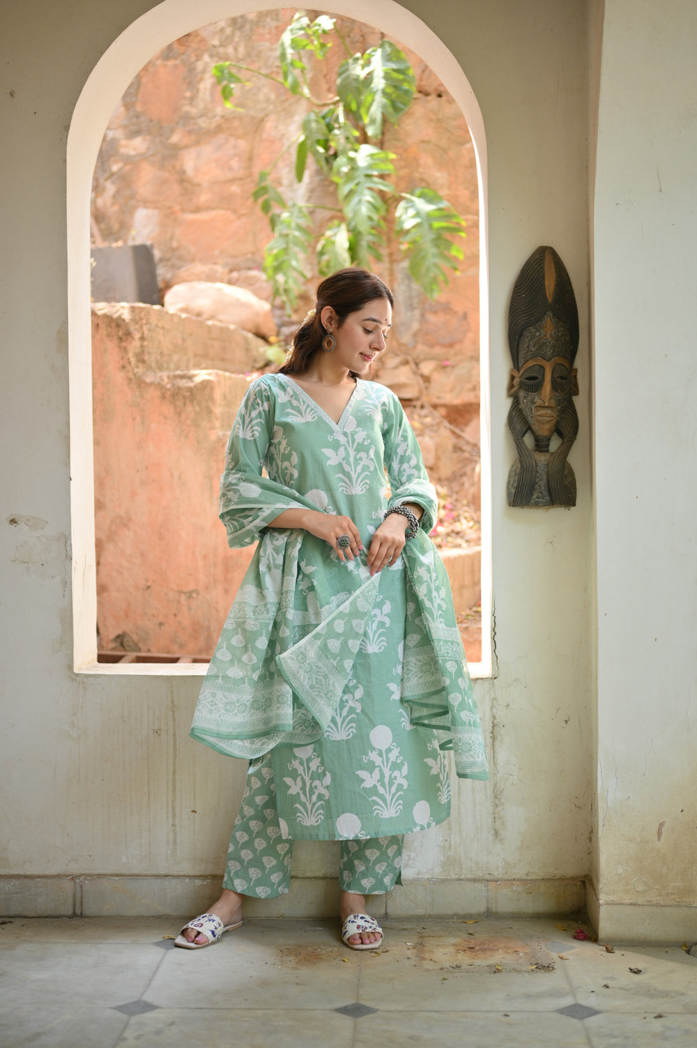 This suit set has floral prints all over it. It comes with soft cotton voile dupatta with print all over it. The entire print technique used is screen printing. Bottom is made in pants with side pockets.
