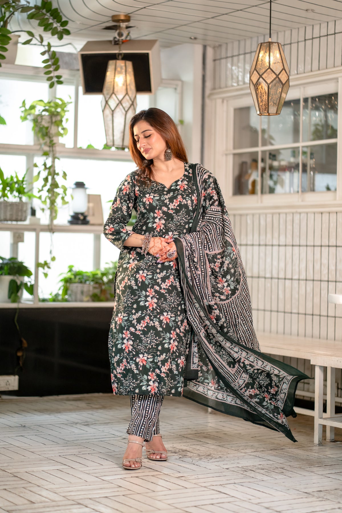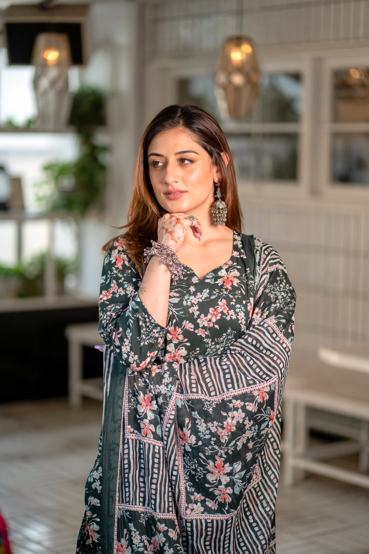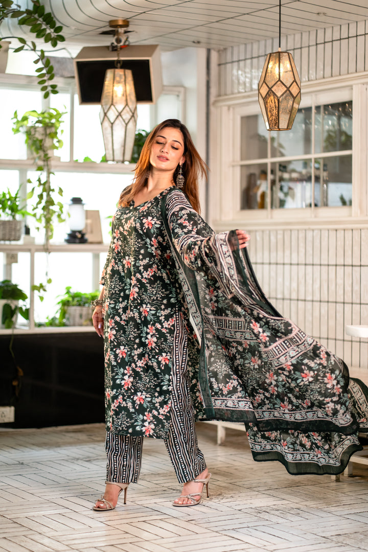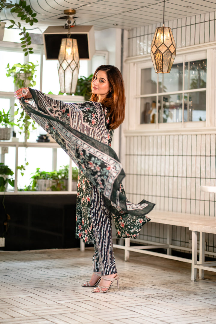 This suit set has traditional ethnic motifs print all over it. It comes with soft cotton dupatta with print all over it. The entire print technique used is handblock. Bottom is made in pants with side pockets.