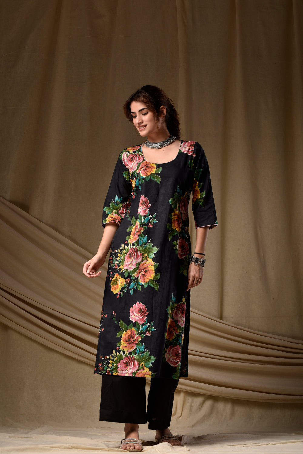 Pure cotton kurta is made in straight cut. It has floral motifs in digital print all over it. It is soft and comfortable, can be teamed up with variety of bottoms.