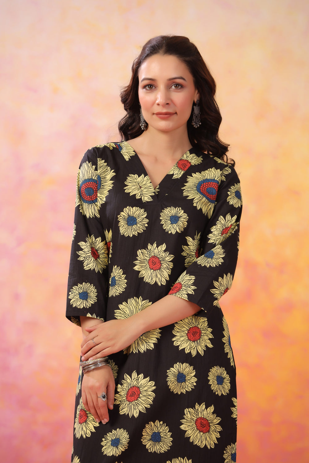 Pure cotton kurta is made in straight cut. It has floral motifs in screen print. It is soft and comfortable, can be teamed up with variety of bottoms.