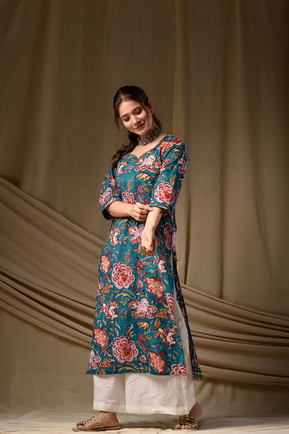Teal Floral Straight Kurta
