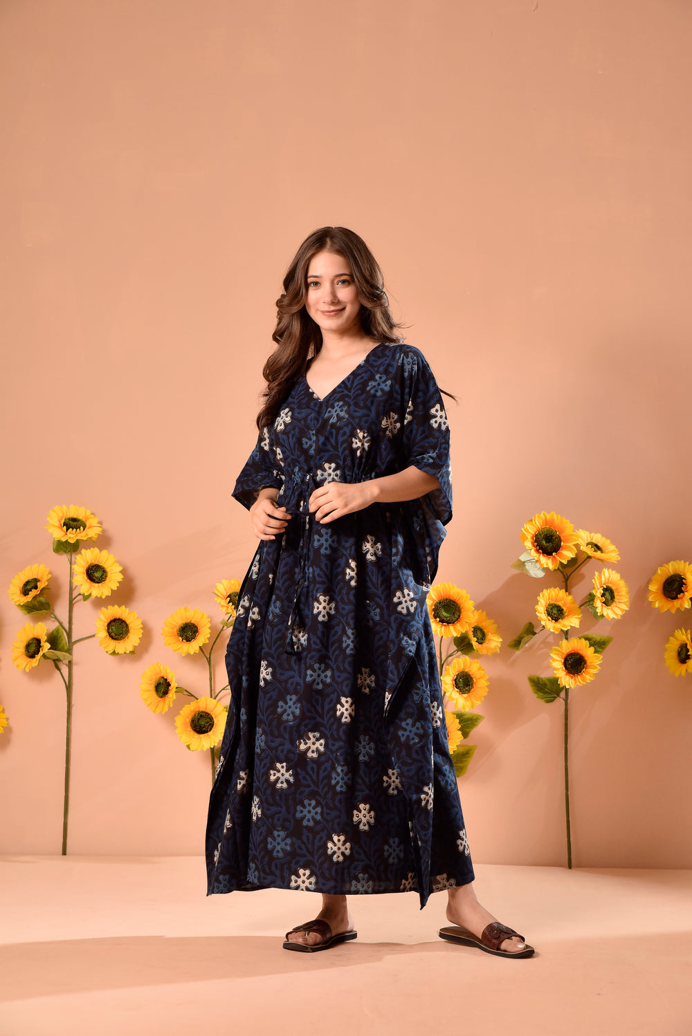 Pure cotton kaftan made with floral hand-block print all over it. It has adjustable drawstrings.
