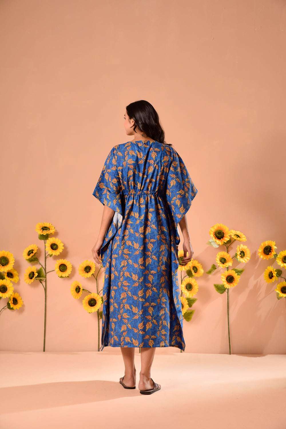 Pure cotton kaftan made with floral screen print all over it. It has adjustable drawstrings.