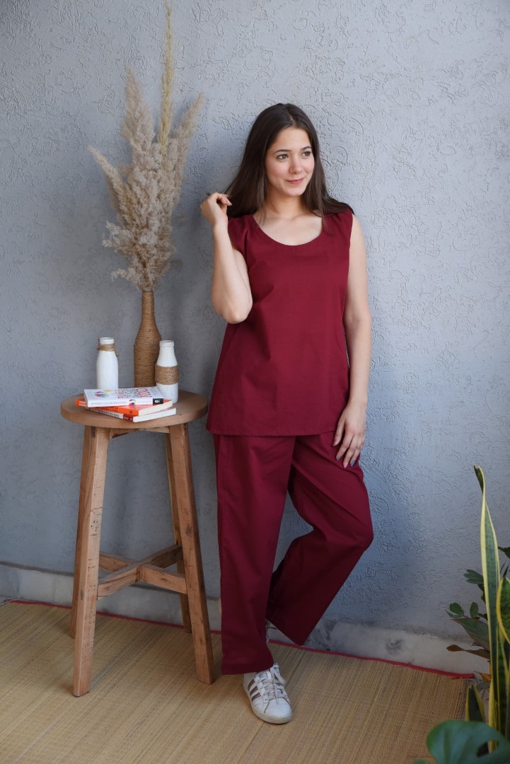 Maroon color leisure wear is perfect outfit for night wear and market stroll. The top is without sleeves and pants have full elastic with pockets.