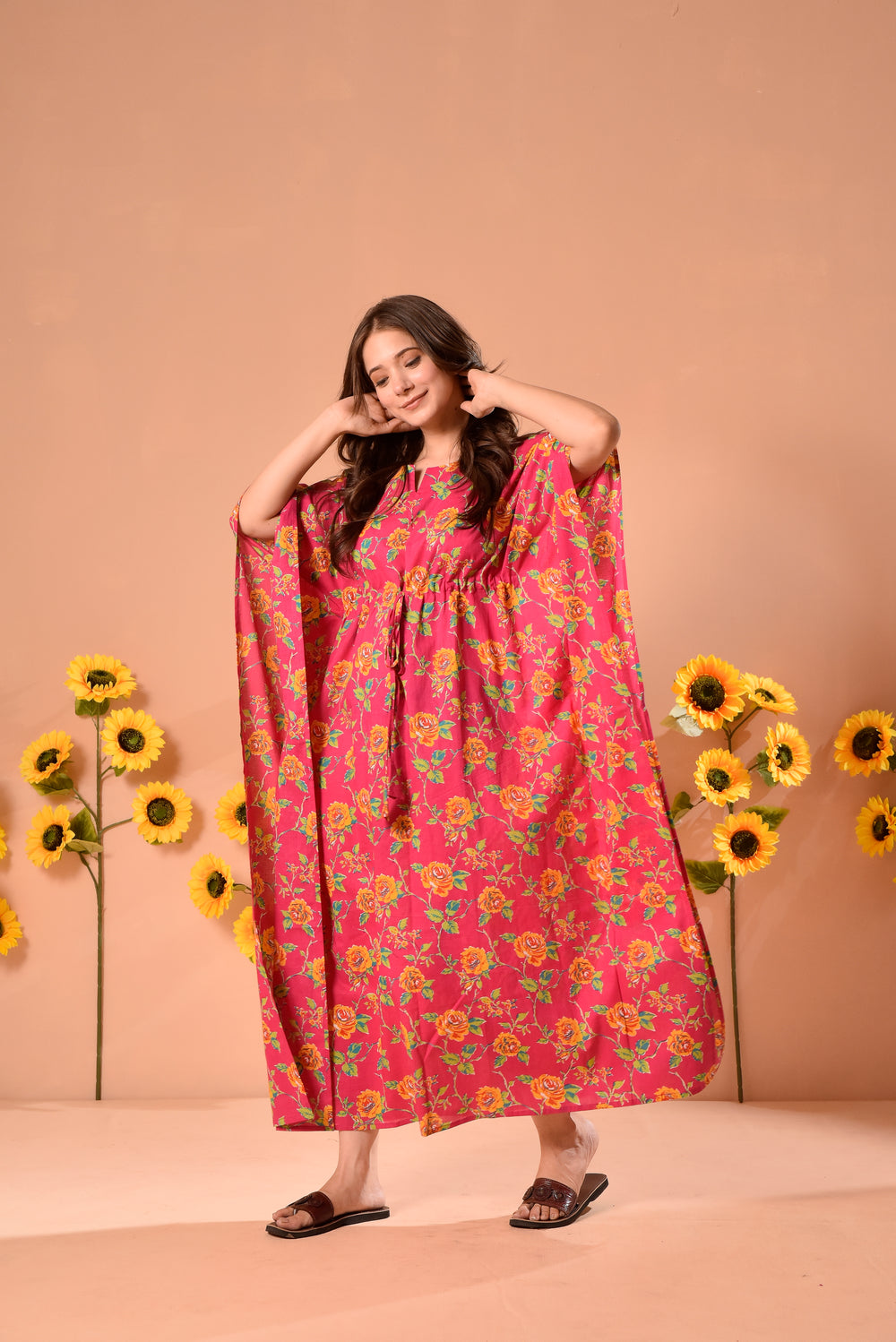 Pure cotton kaftan made with floral screen print all over it. It has adjustable drawstrings.