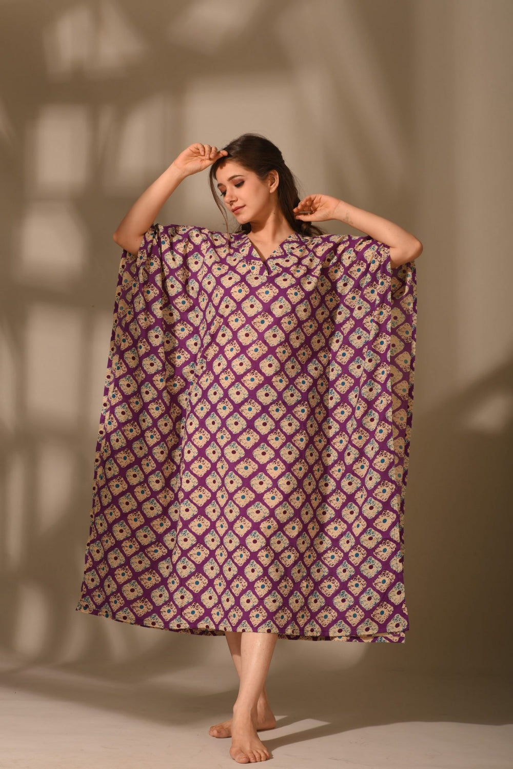 Pure cotton kaftan in purple color is a straight cut loose outfit for leisure wear and beach wear. Traditional Ikkat print is crafted on this beautiful kaftan.