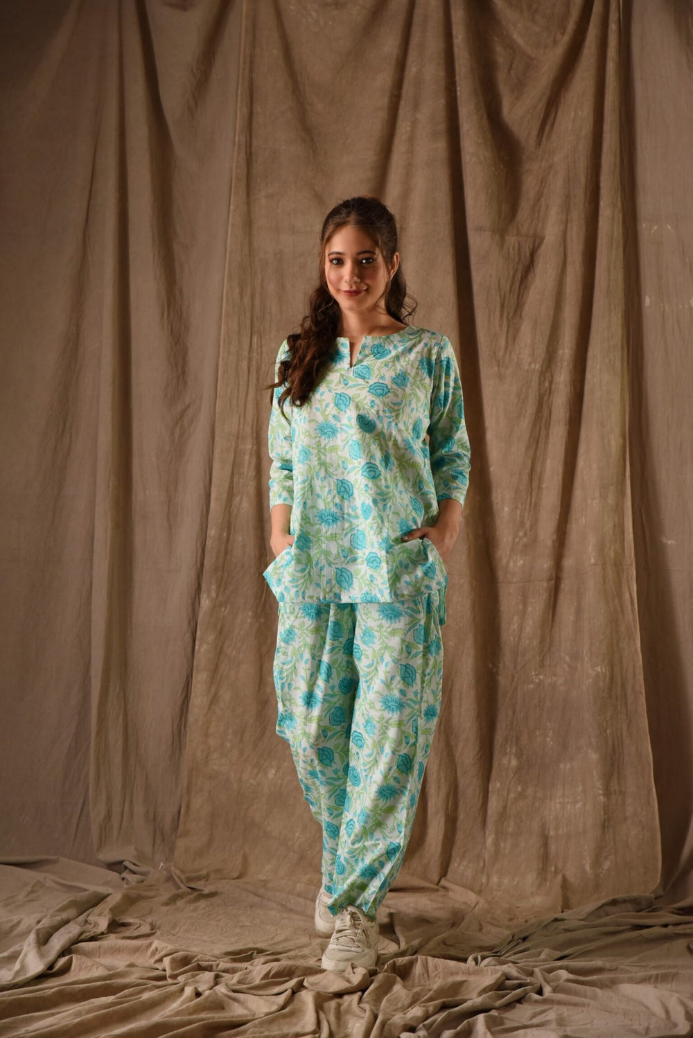 Pure cotton leisure wear comes with top and bottom in comfort style. Bottom has all over elastic and drawstrings on waist. This beautiful piece has handblock floral motifs all over it.