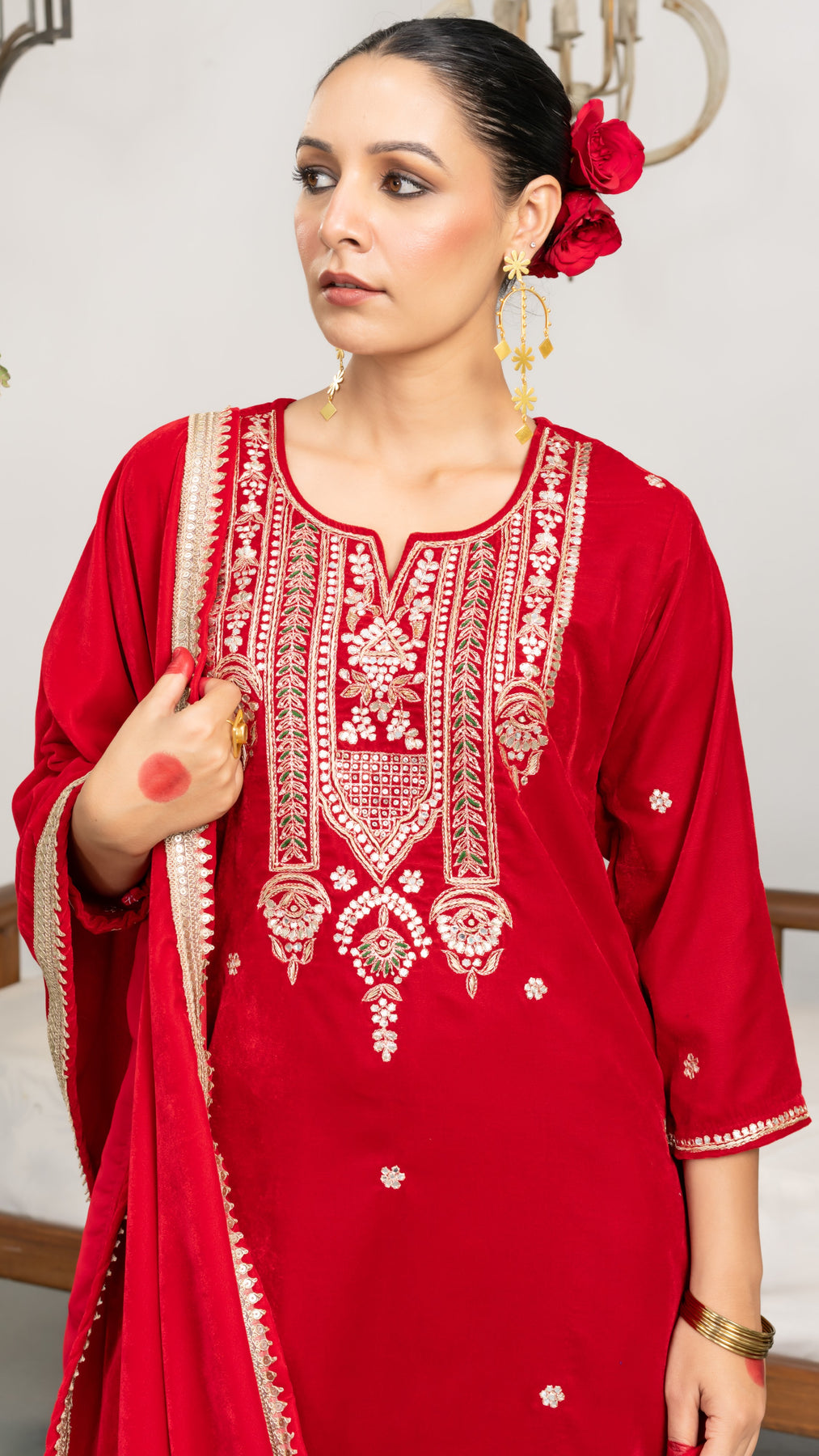 This beautiful suit set is crafted on synthetic velvet. It has delicate hand embroidery of gota marodi on front of kurta and sleeves. Kurta has soft lining. Pants are cut in straight. It has pockets on both sides with front draw strings. It comes with velvet shawl.