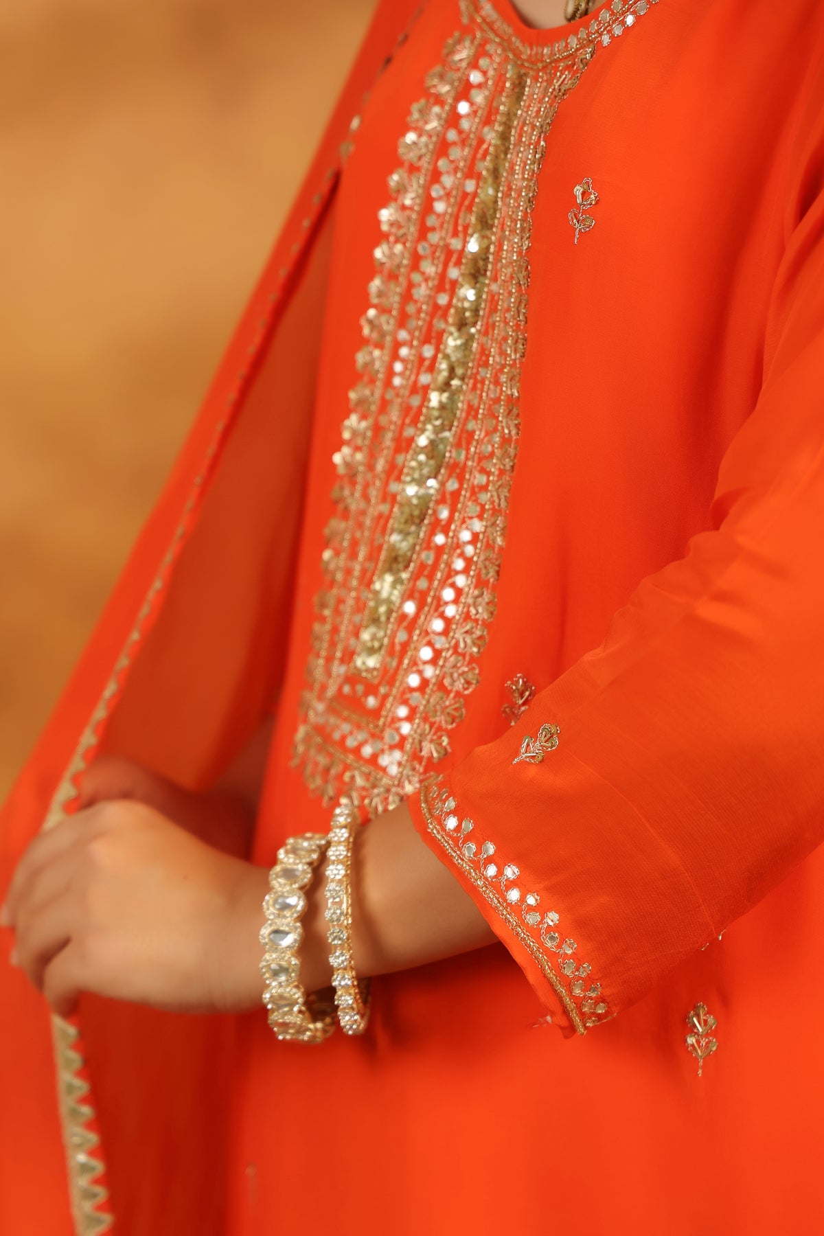 Kurta has beautiful handwork of gota patti embroidery. Sleeves have delicate handwork of gota. Pants are in crepe fabric with lining.