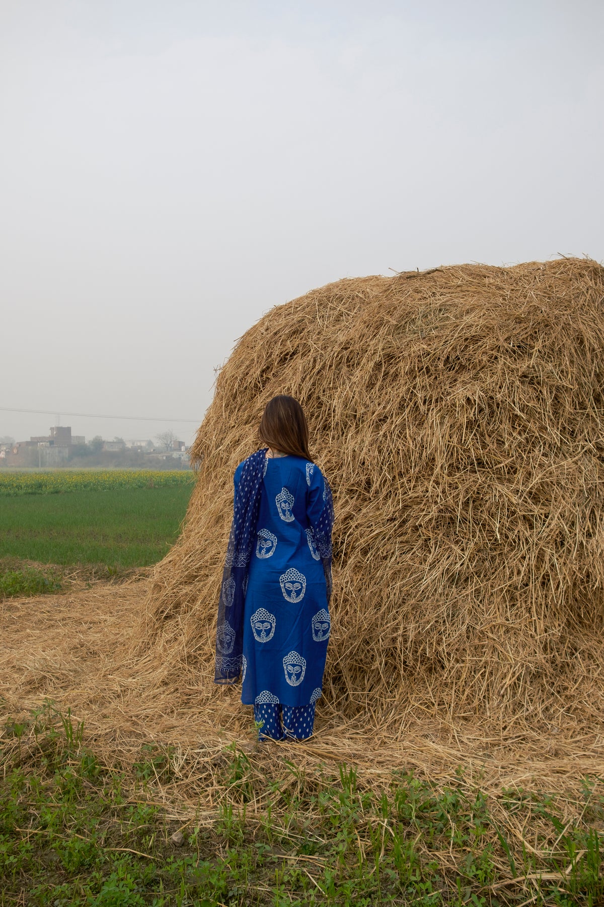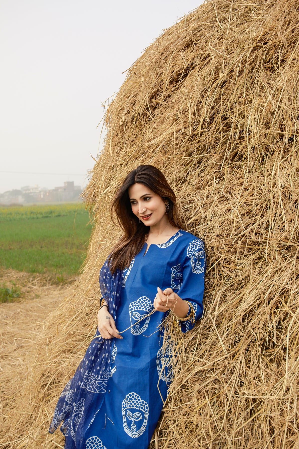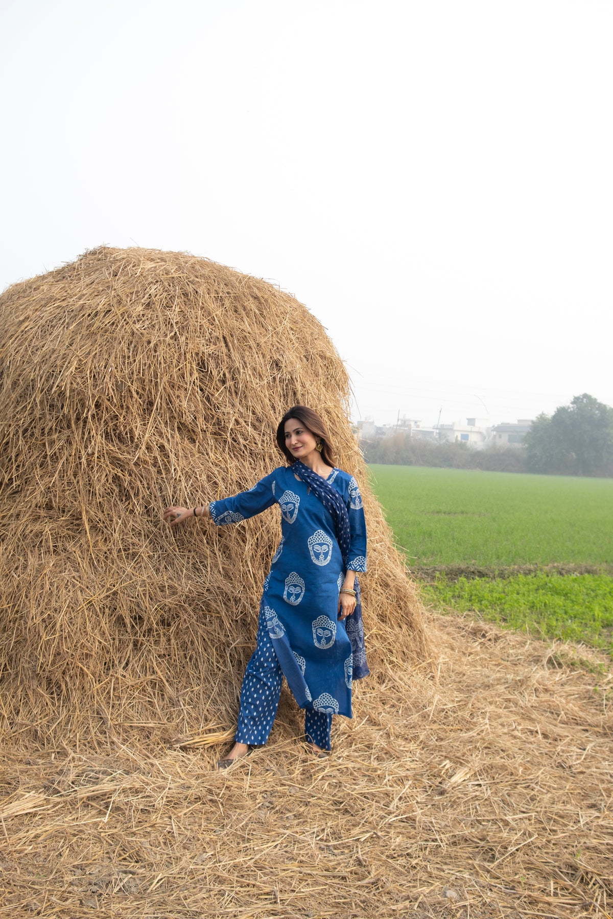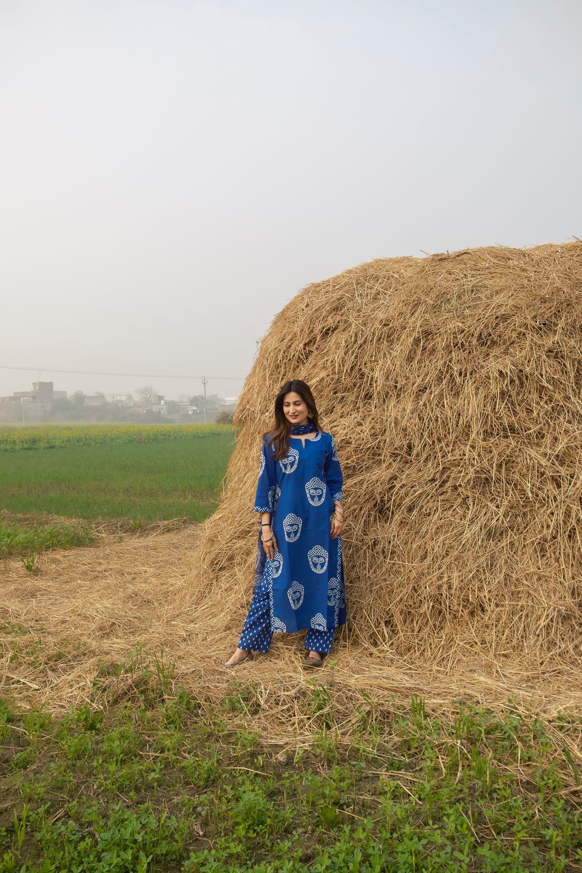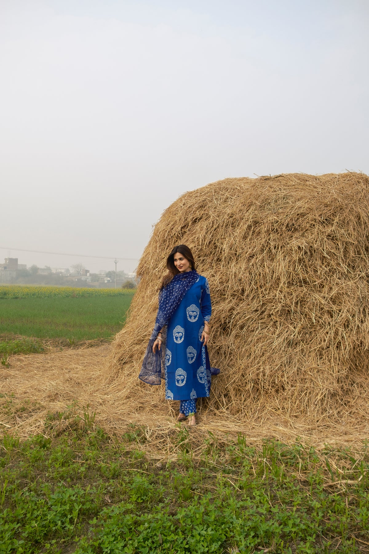 This suit set has buddha print all over it. It comes with soft chiffon dupatta with print all over it. The entire print technique used is handblock. Bottom is made in pants with side pockets.