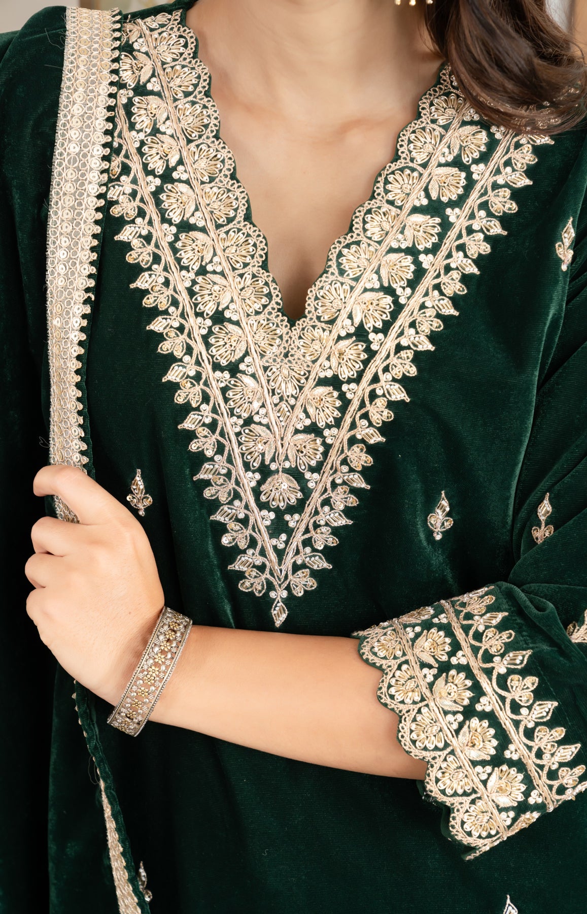 This beautiful suit set is crafted on synthetic velvet. It has delicate hand embroidery of gota zardozi on front of kurta and sleeves. Kurta has soft lining. Pants are cut in straight. It has pockets on both sides with front draw strings. It comes with velvet shawl.