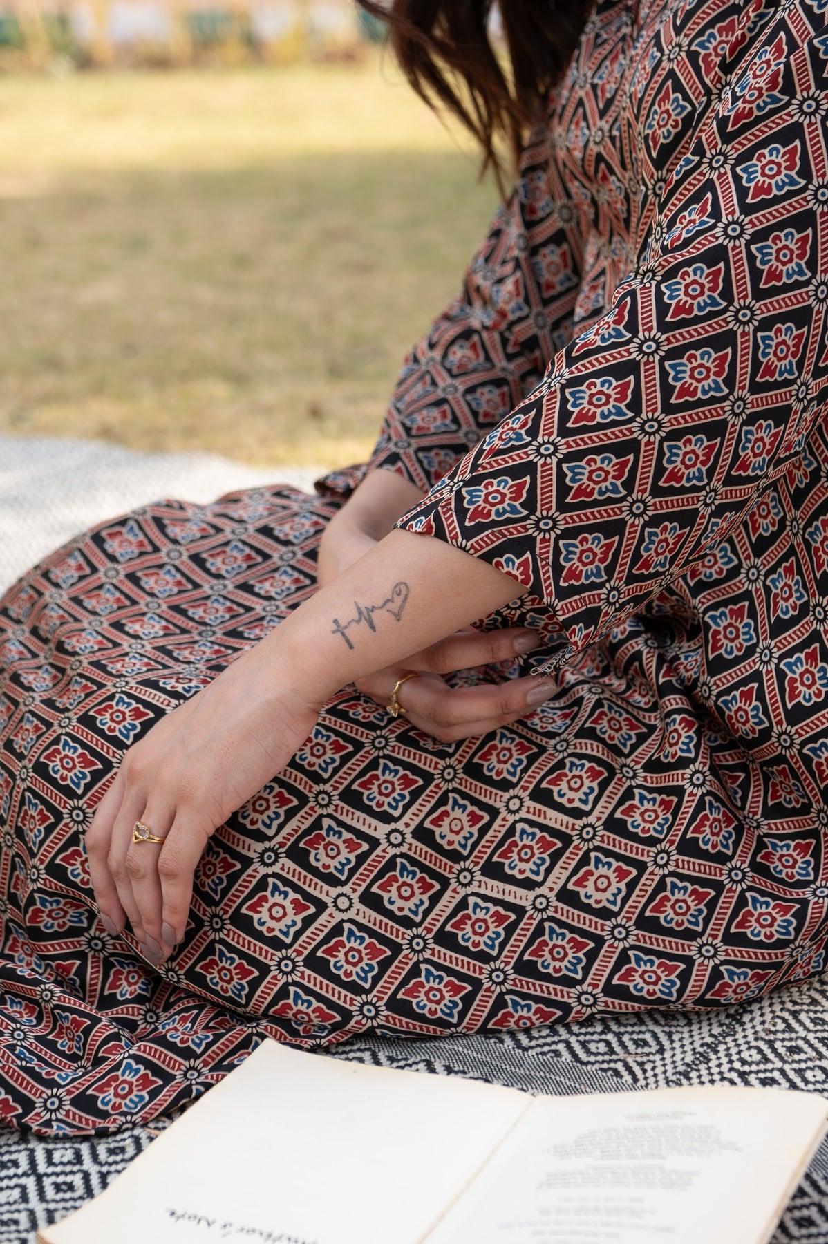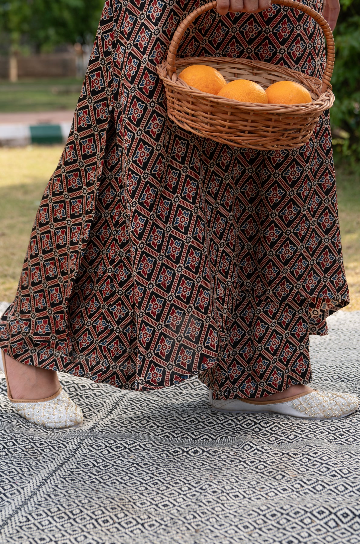 This pretty outfit is made in modal satin which is rich looking and elegant. Kurta is in A-line cut with wide leg palazzo. It has authentic ajrakh printing all over the suit set. Set comes with kurta and palazzo.