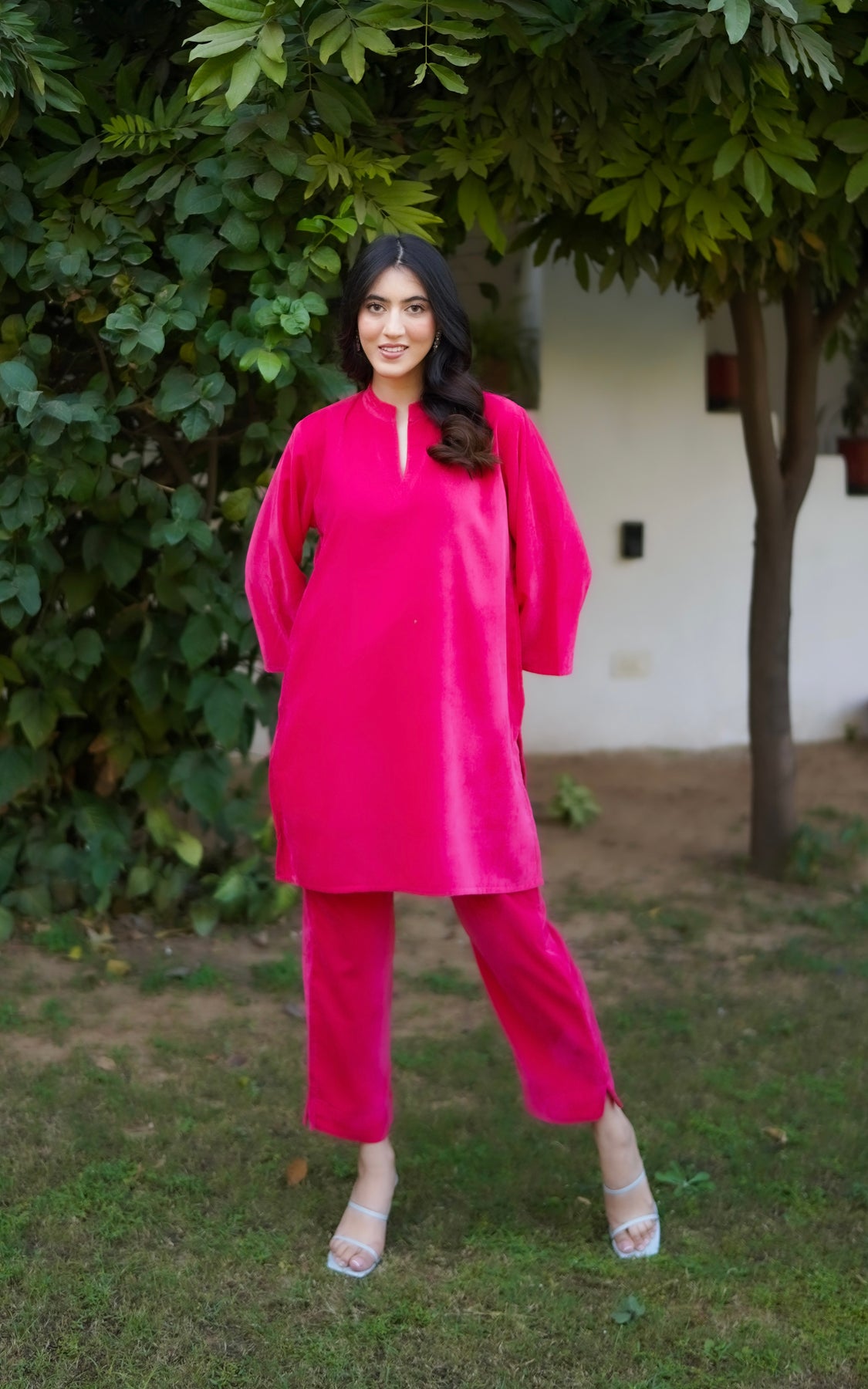 This beautiful co-ord set is made on micro velvet which is warm and lustrous. Sleeves are in A-line cut. This co-ord set comes with straight pants. Pants have front drawstrings and pockets on both sides.