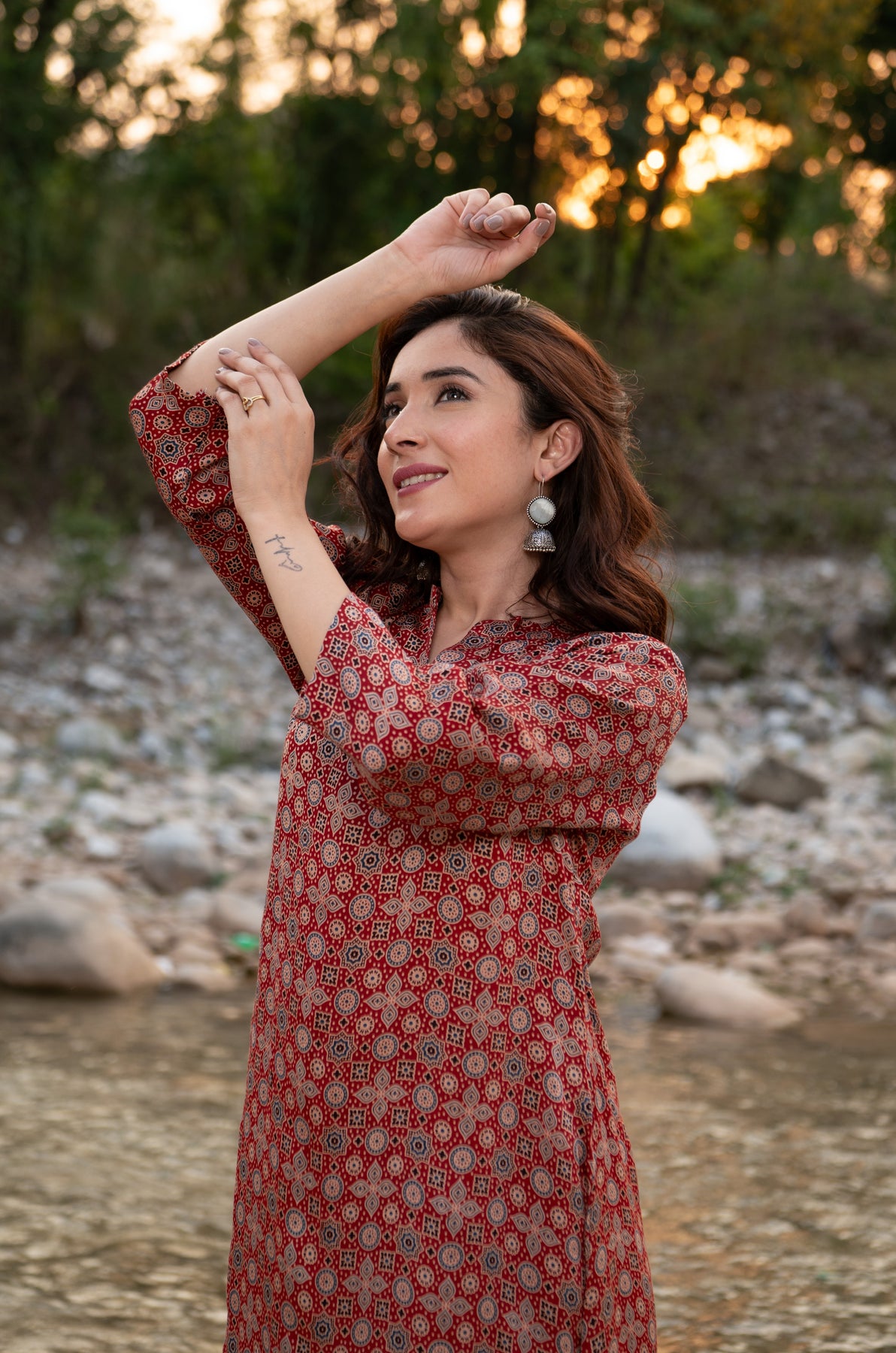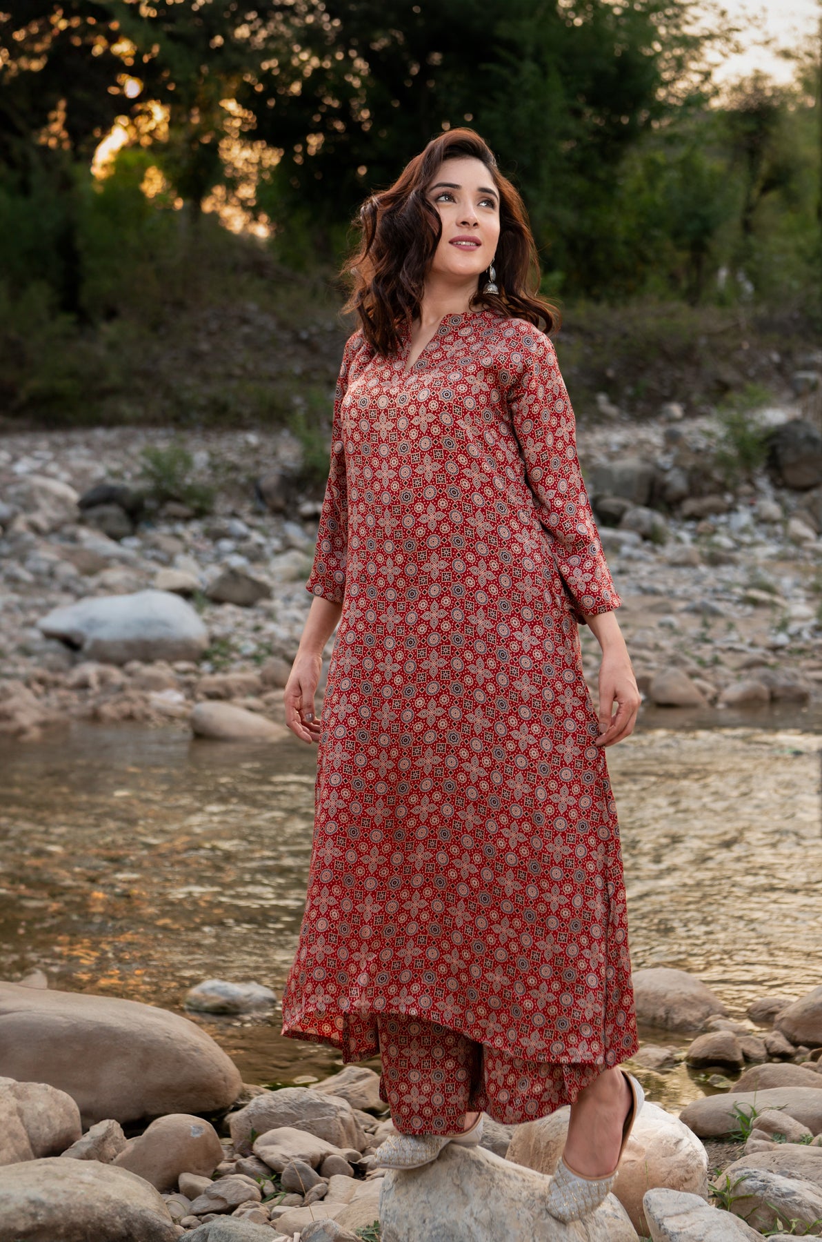 This pretty outfit is made in modal satin which is rich looking and elegant. Kurta is in A-line cut with wide leg palazzo. It has authentic ajrakh printing all over the suit set. Set comes with kurta and palazzo.