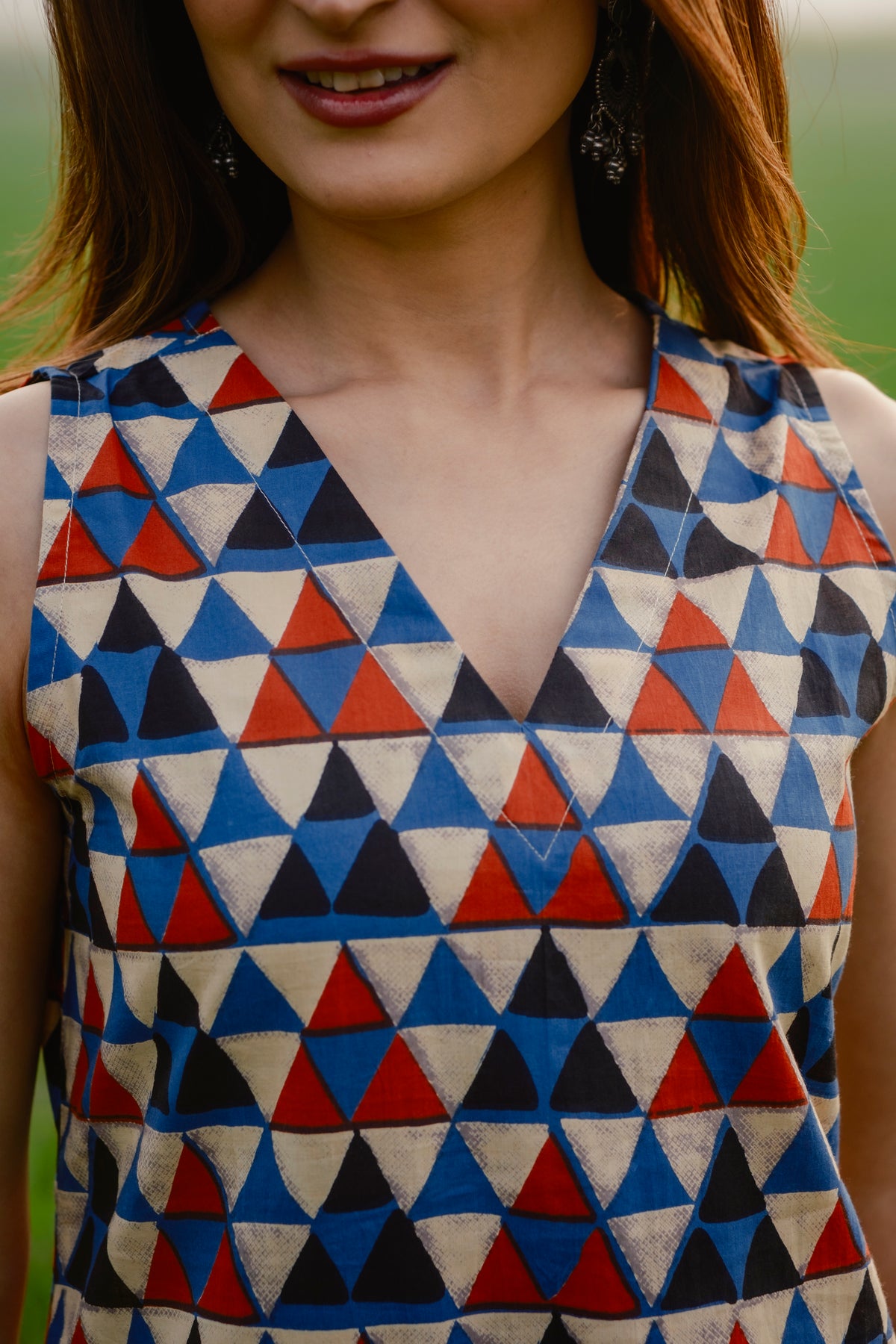 This kurta pant set has triangle motifs print all over it. Kurta is in straight cut. The entire print technique used is screen print. Bottom is made in wide leg palazzo with side pockets.