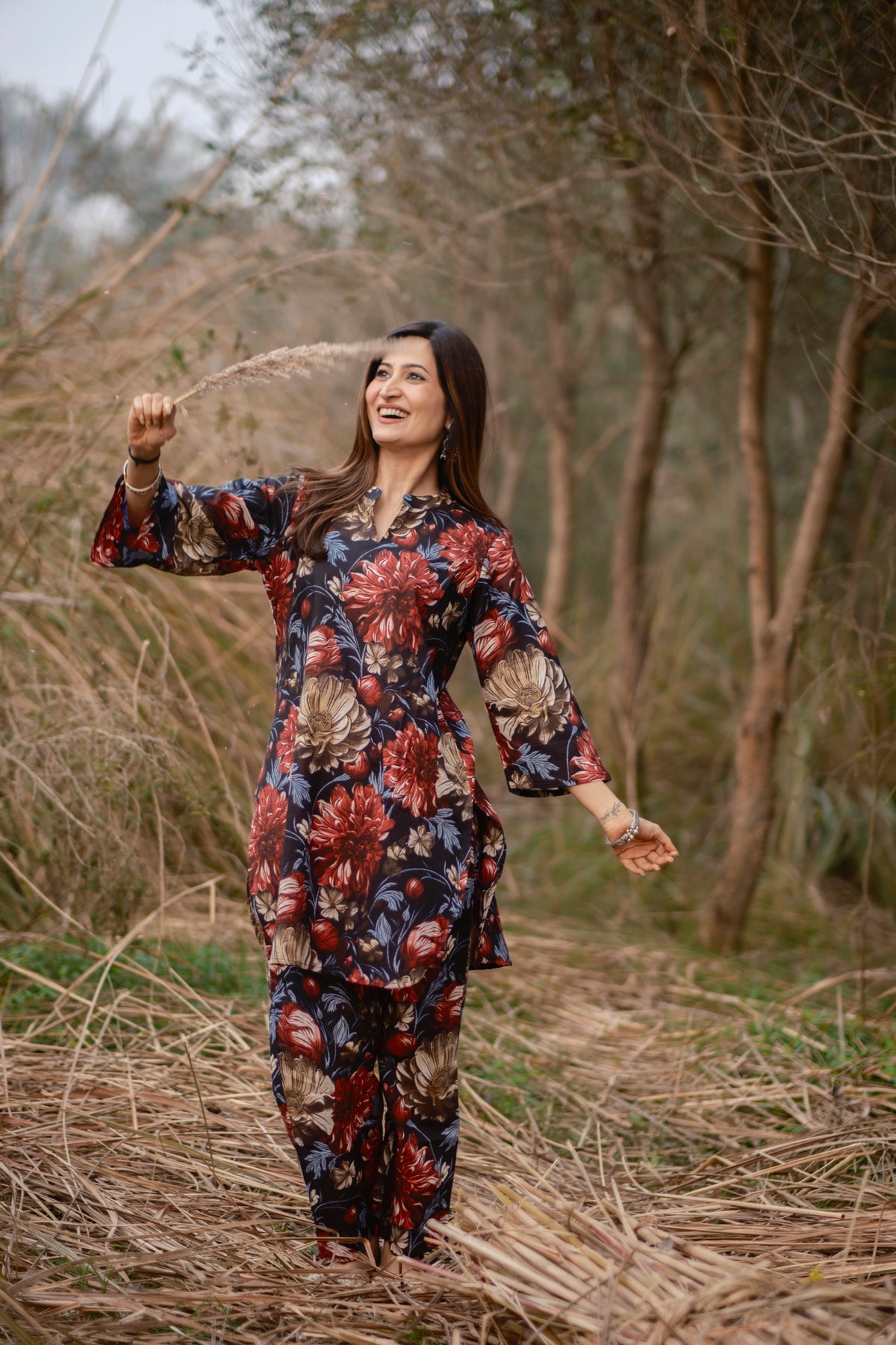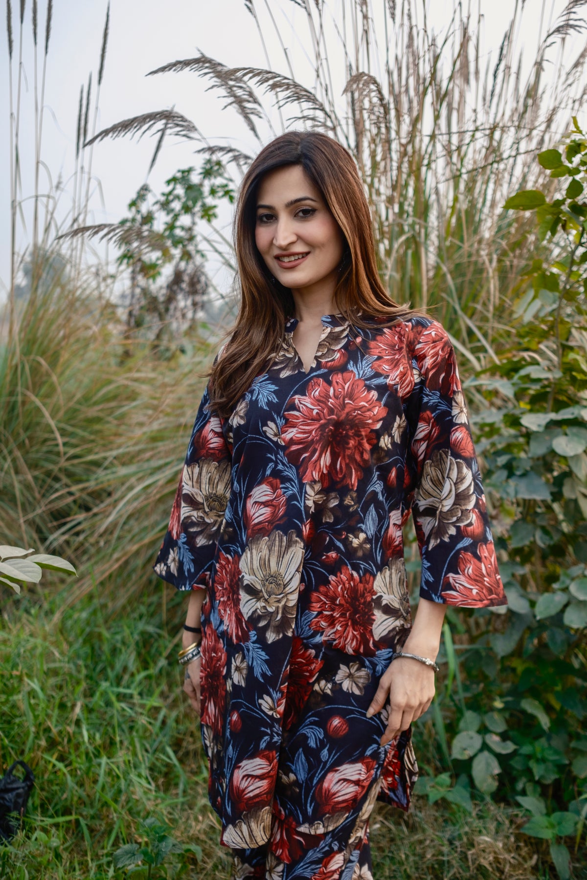 This beautiful co-ord set is made on pure cotton with floral pattern all over. It has screen print all over it. Sleeves are in A-line cut. This co-ord set comes with straight pants. Pants have front drawstrings and pockets on both sides.