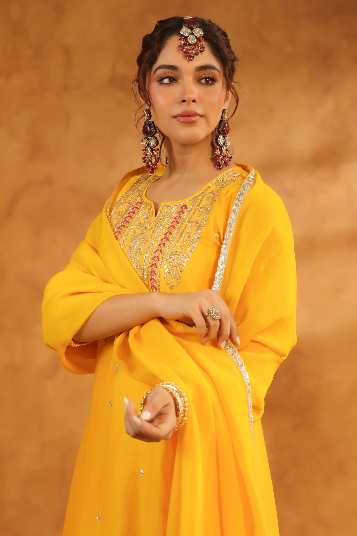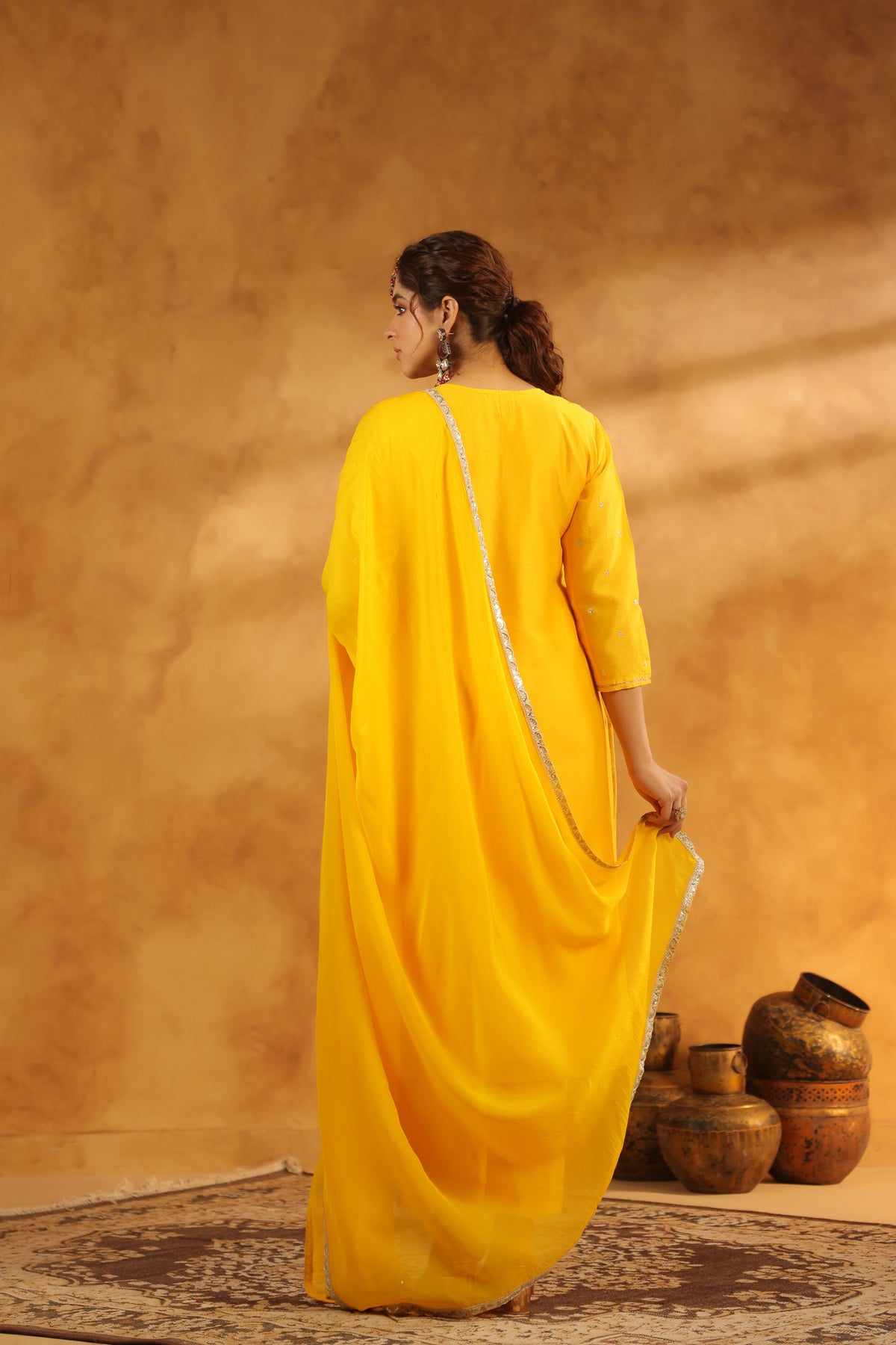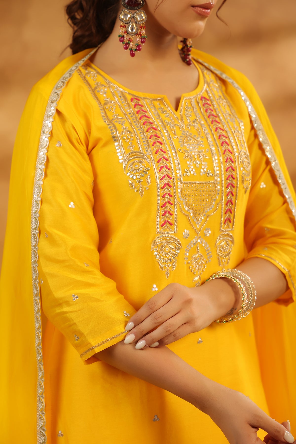 The kurta set is crafted in cotton chanderi which has beautiful gota patti hand embroidery near neckline. Kurta has soft lining. Pants are in soft cotton chanderi and straight cut. It has side pockets with front drawstrings. Dupatta is in organza with lace all across near borders.