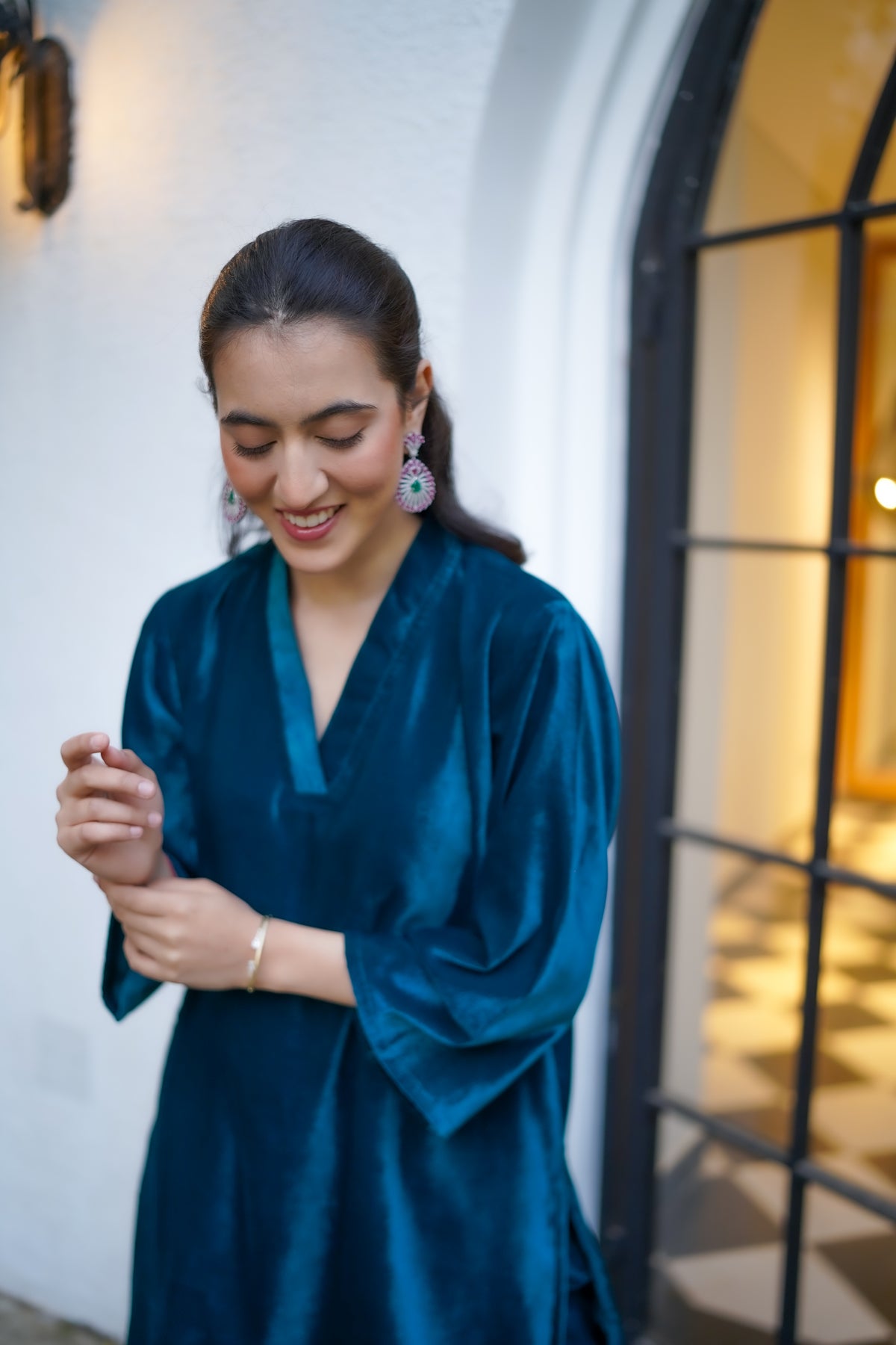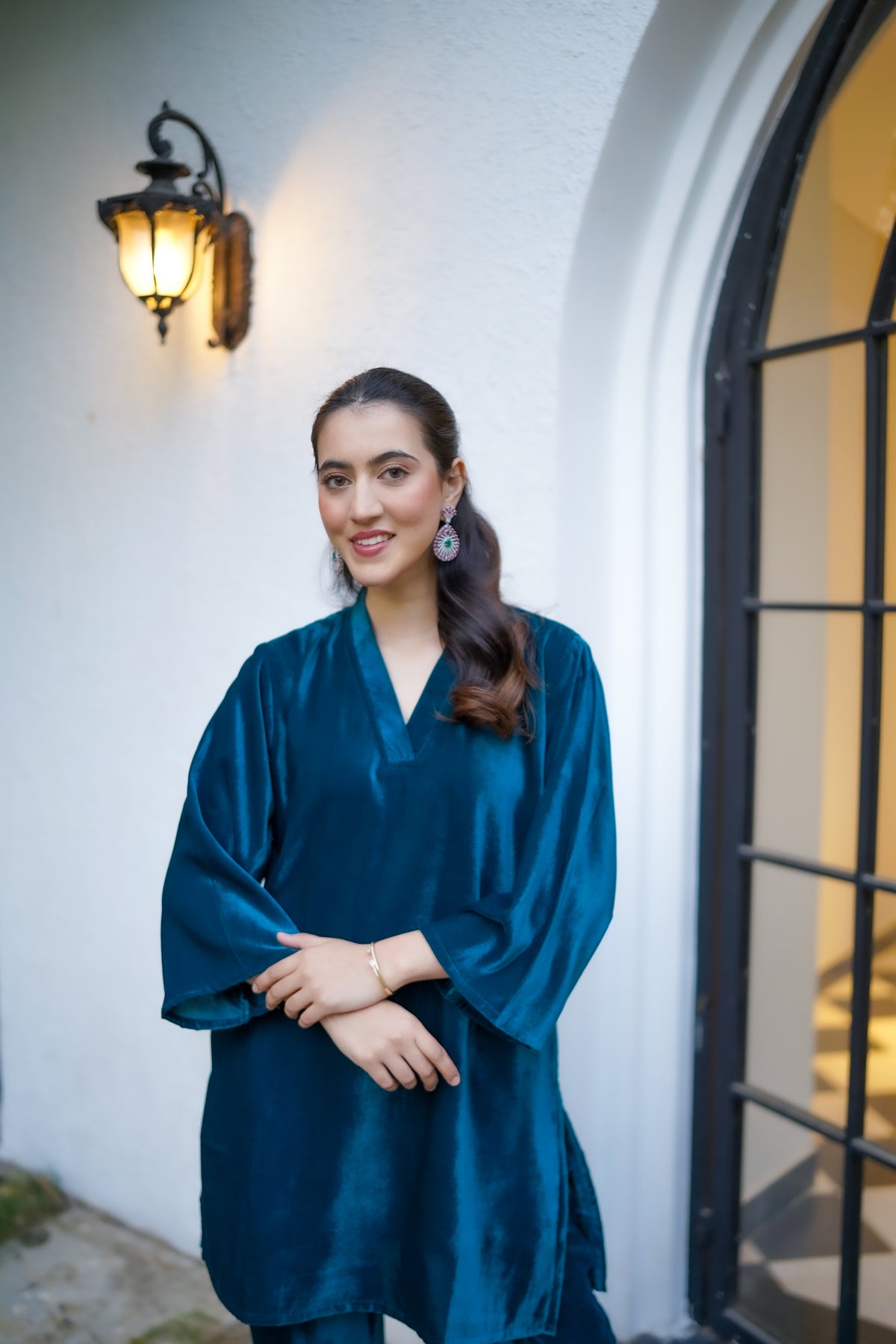 This beautiful co-ord set is made on micro velvet which is warm and lustrous. Sleeves are in A-line cut. This co-ord set comes with straight pants. Pants have front drawstrings and pockets on both sides.