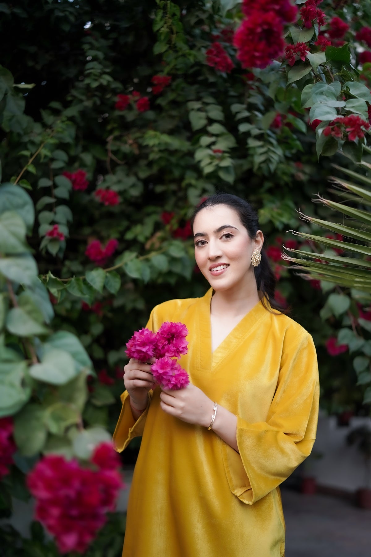 This beautiful co-ord set is made on micro velvet which is warm and lustrous. Sleeves are in A-line cut. This co-ord set comes with straight pants. Pants have front drawstrings and pockets on both sides.