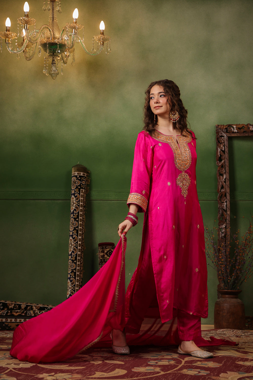 This beautiful suit set is crafted in semi silk. It has delicate hand embroidery of marodi in front of kurta and sleeves. The pants are in semi silk, cut in straight. It has pockets on both sides with front draw strings. Dupatta is in soft organza with lace all across the borders.
