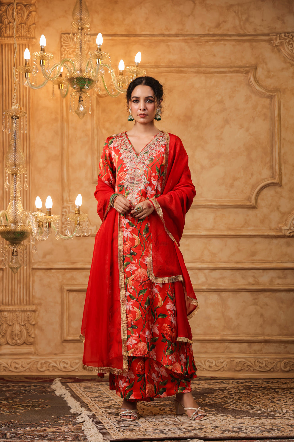 This beautiful suit set is crafted on modal satin fabric. It is designed with floral digital print all over it. It has delicate hand embroidery of aari handwork in front of the kurta and sleeves. Kurta is made in an A-line silhouette. Dupatta is in soft organza with fringes all across the borders.