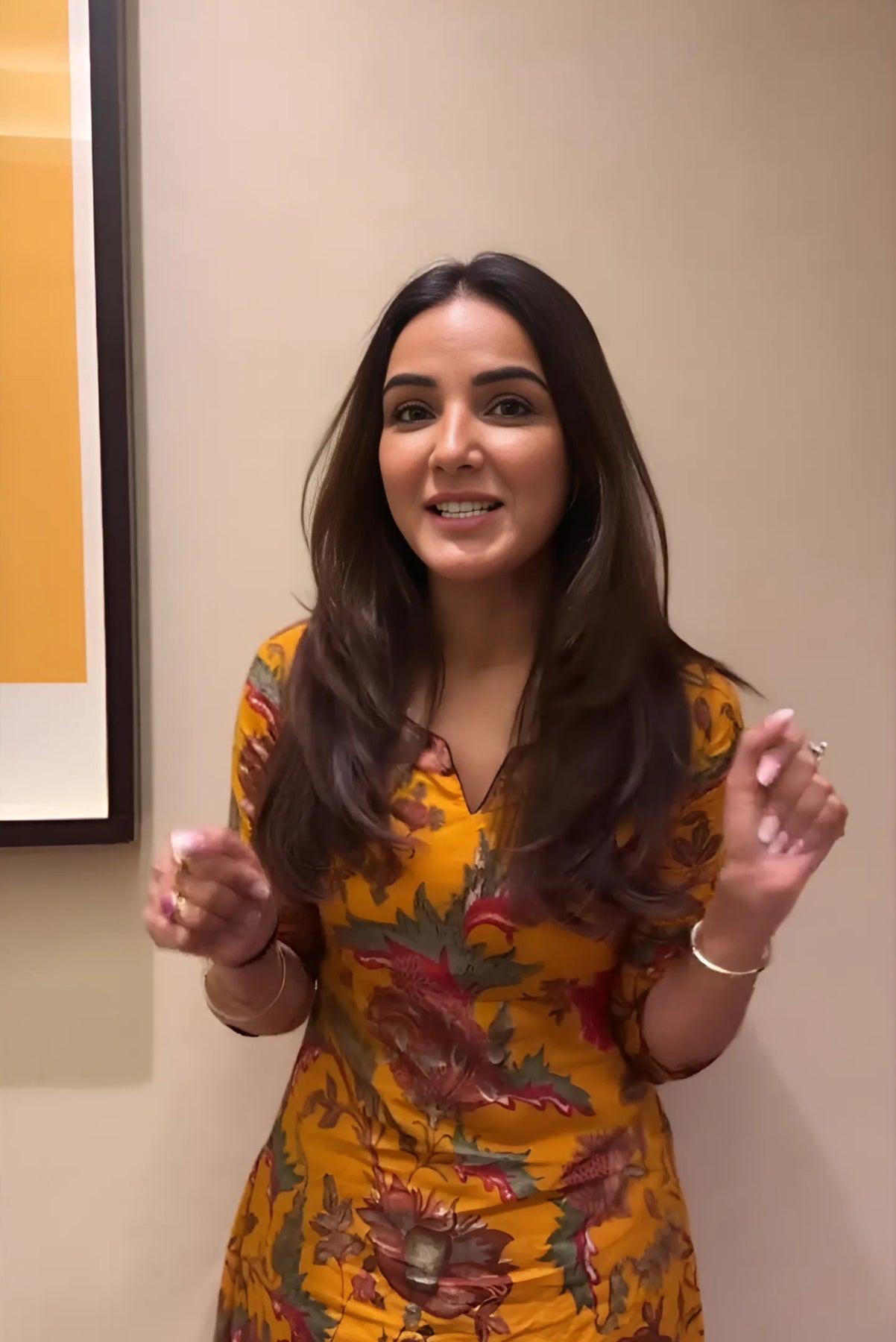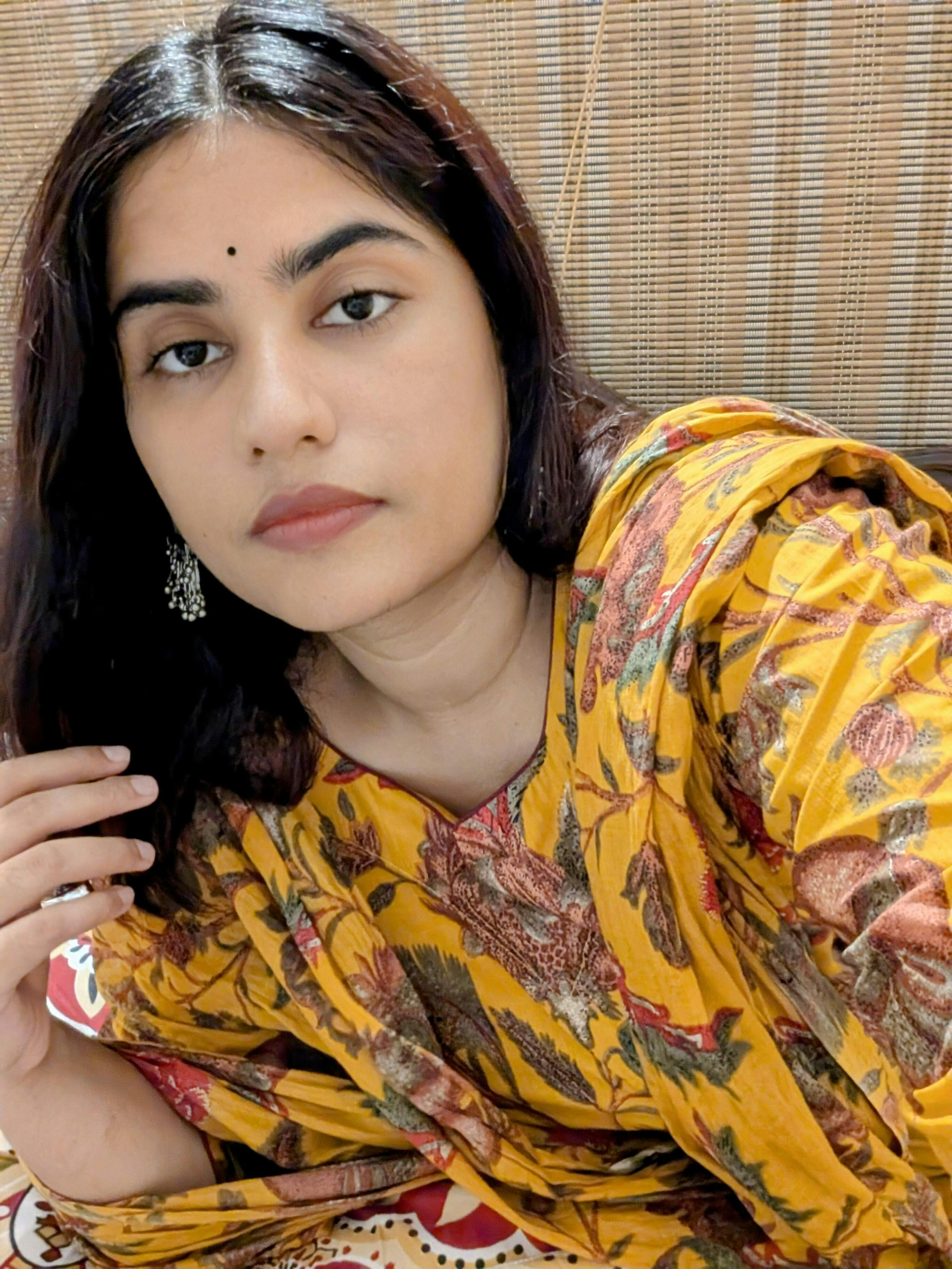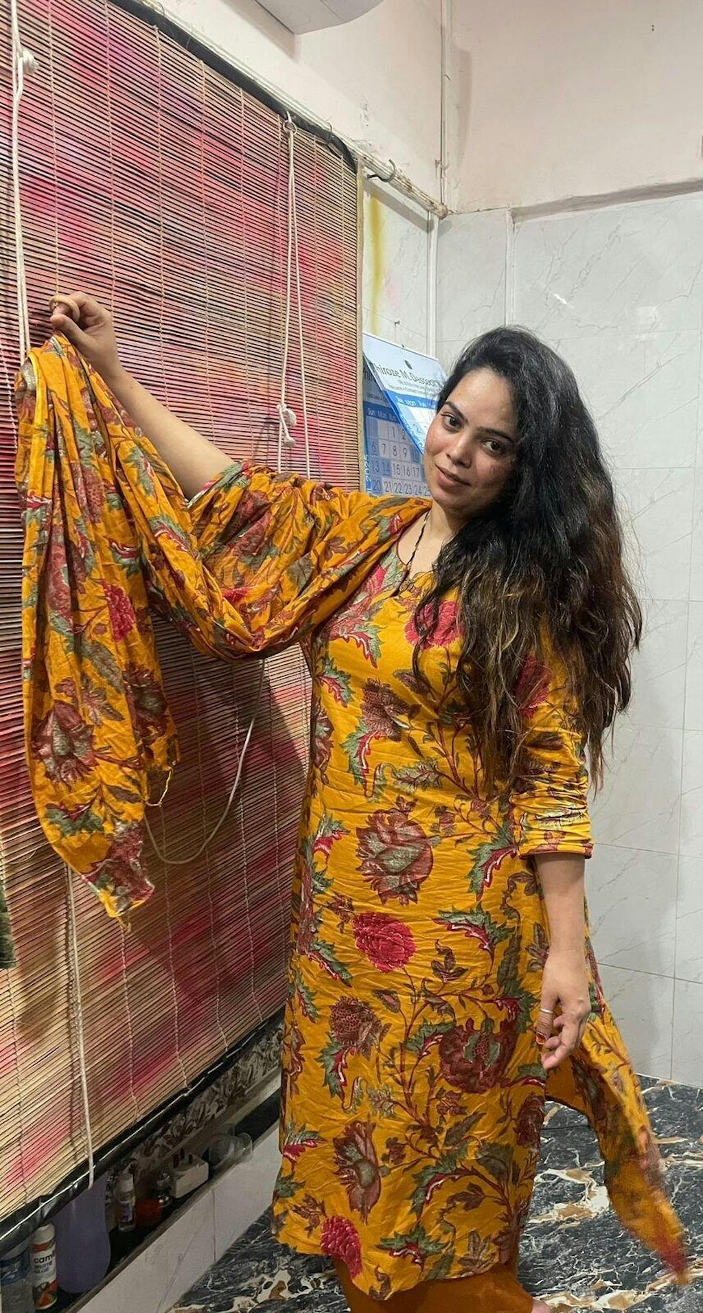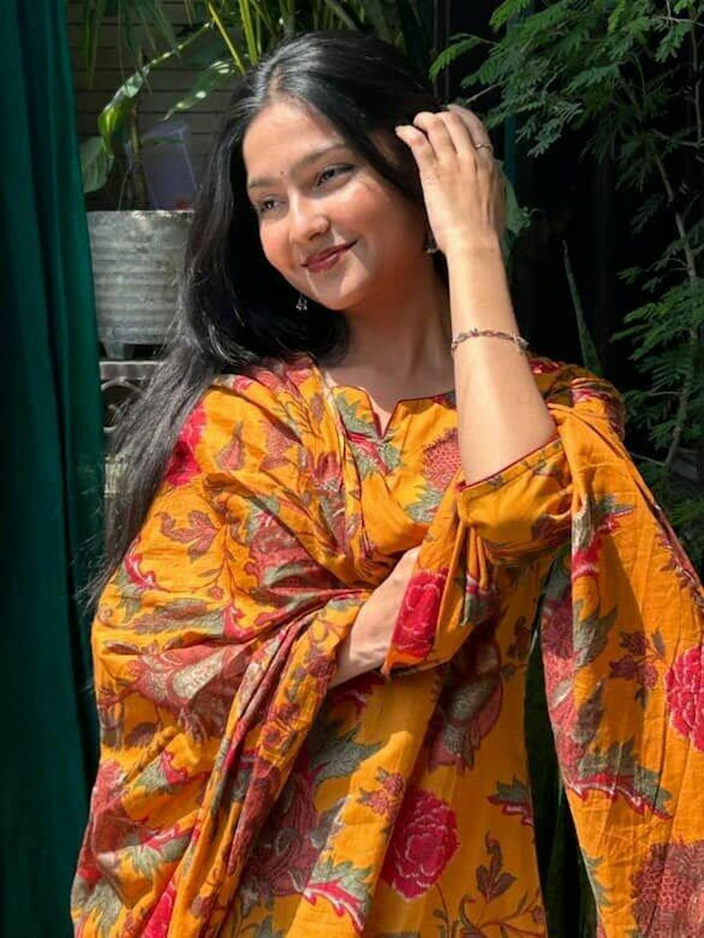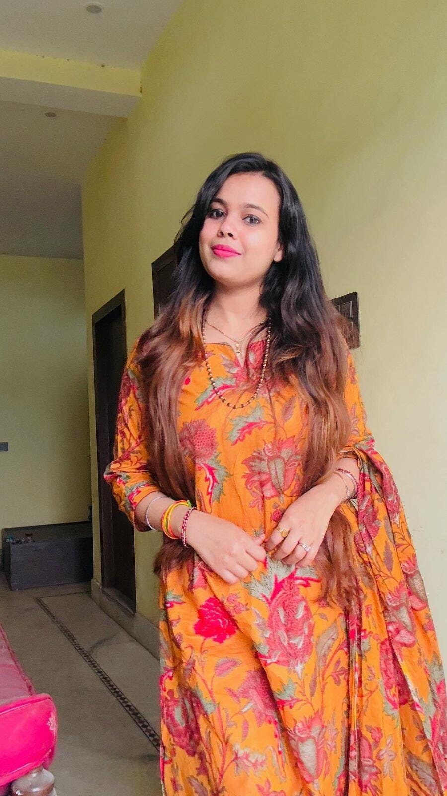 Pure cotton kurta in yellow color is crafted in A-Line style with handblock print all over the kurta. Palazzo is in plain pure cotton and has pockets on both sides. Dupatta is crushed cotton voile with handblock print all over it.