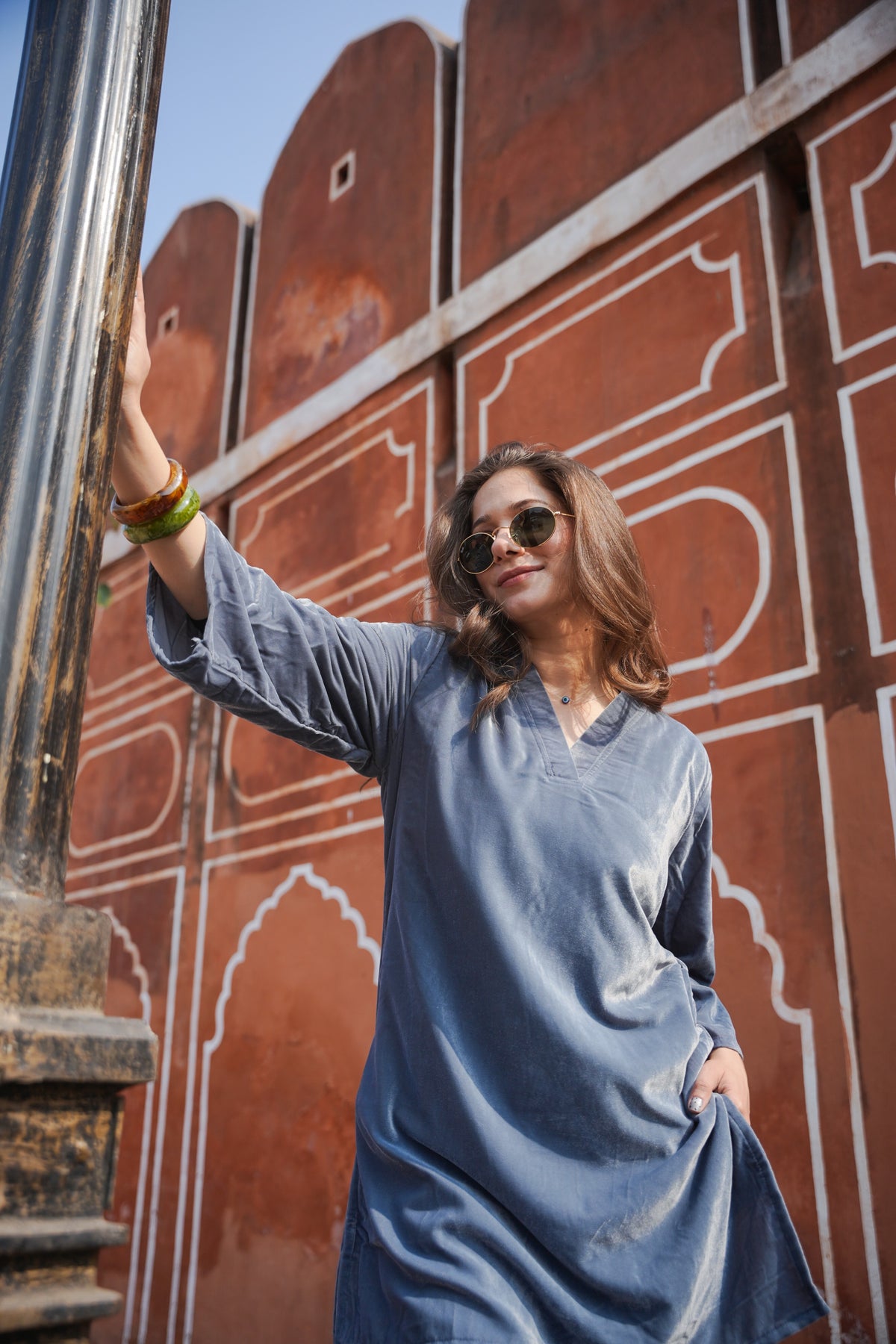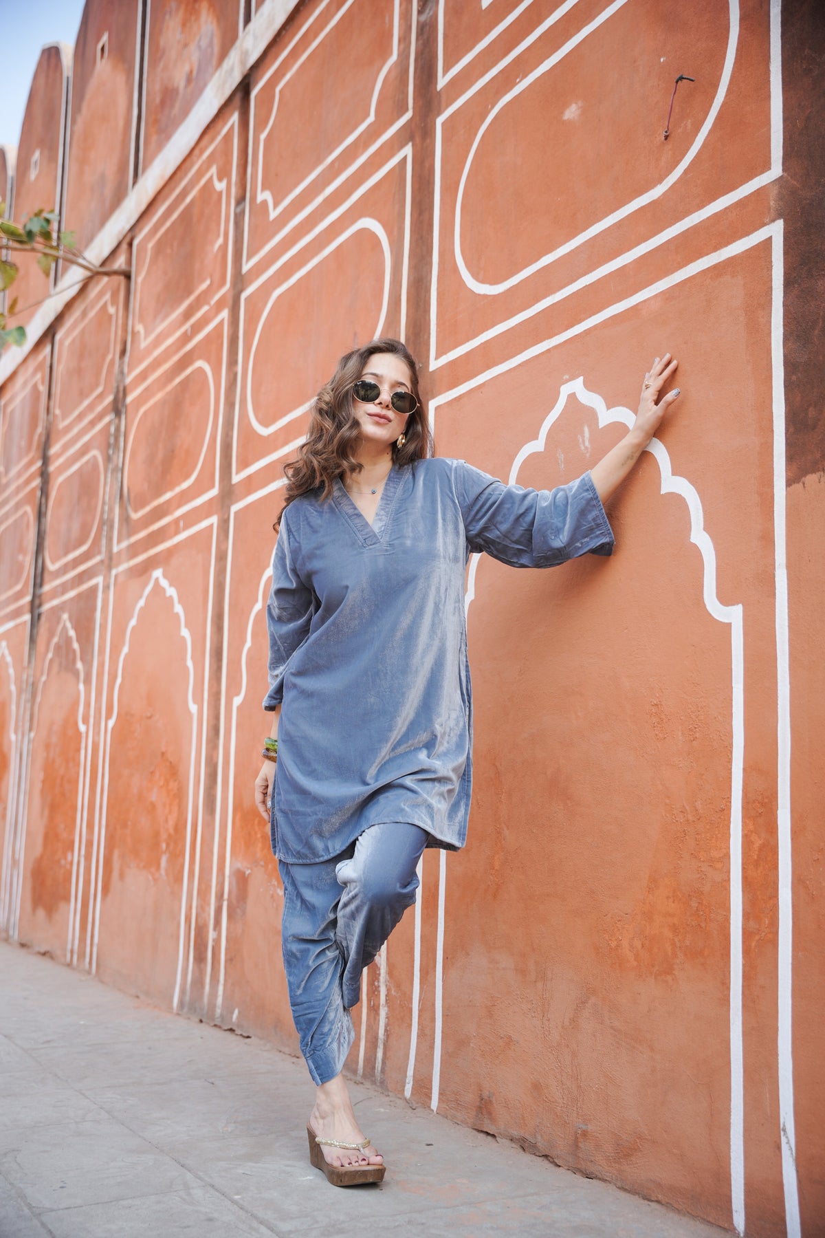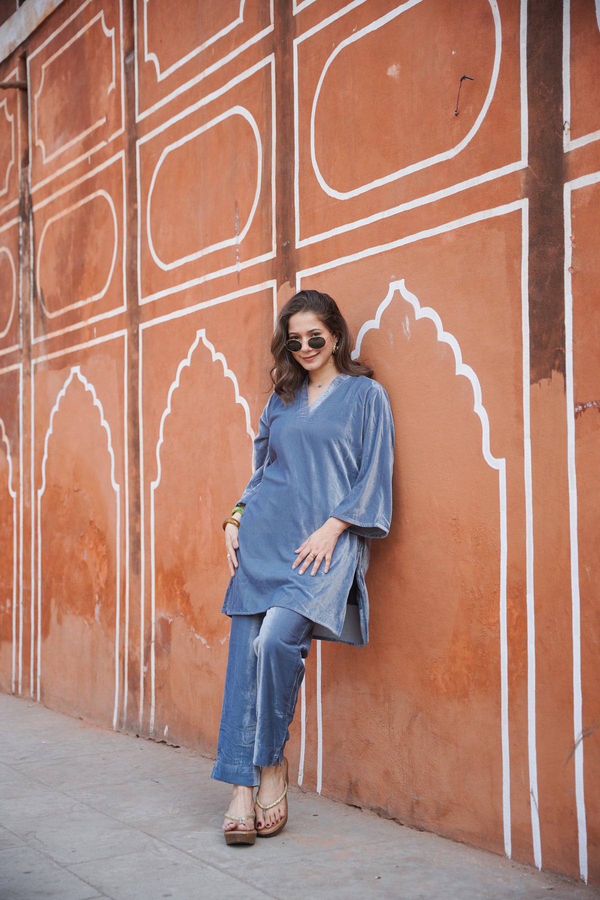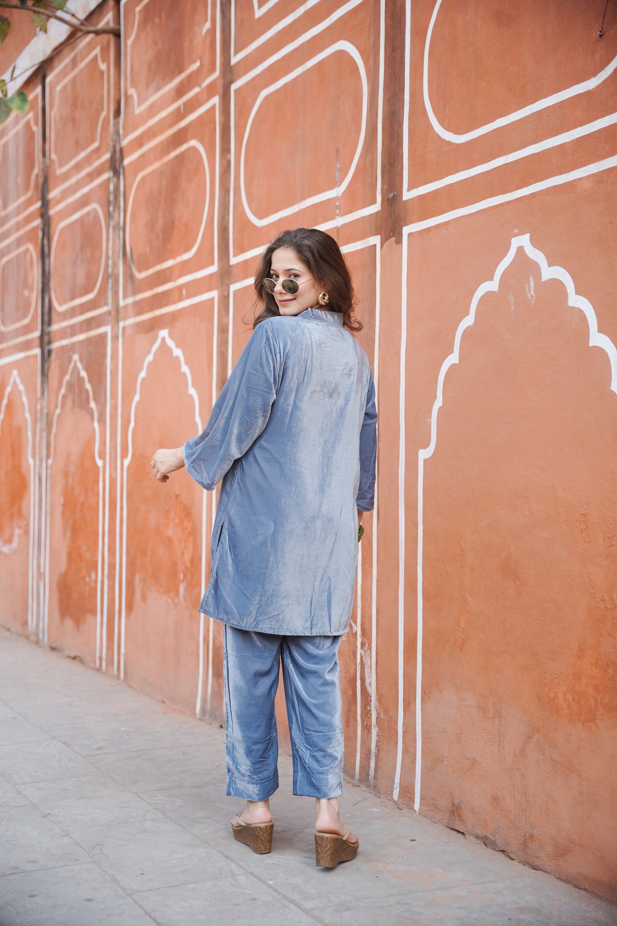 This beautiful co-ord set is made on micro velvet which is warm and lustrous. Sleeves are in A-line cut. This co-ord set comes with straight pants. Pants have front drawstrings and pockets on both sides.