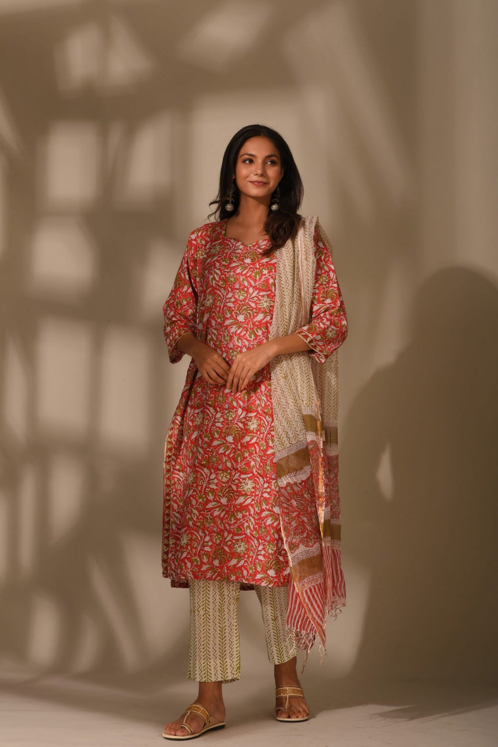 Pure cotton suit set in Handblock print is set in Carrot red color. Dupatta is in soft Kota Doria fabric with all over print on it. Pants have front drawstrings and pockets on each side.