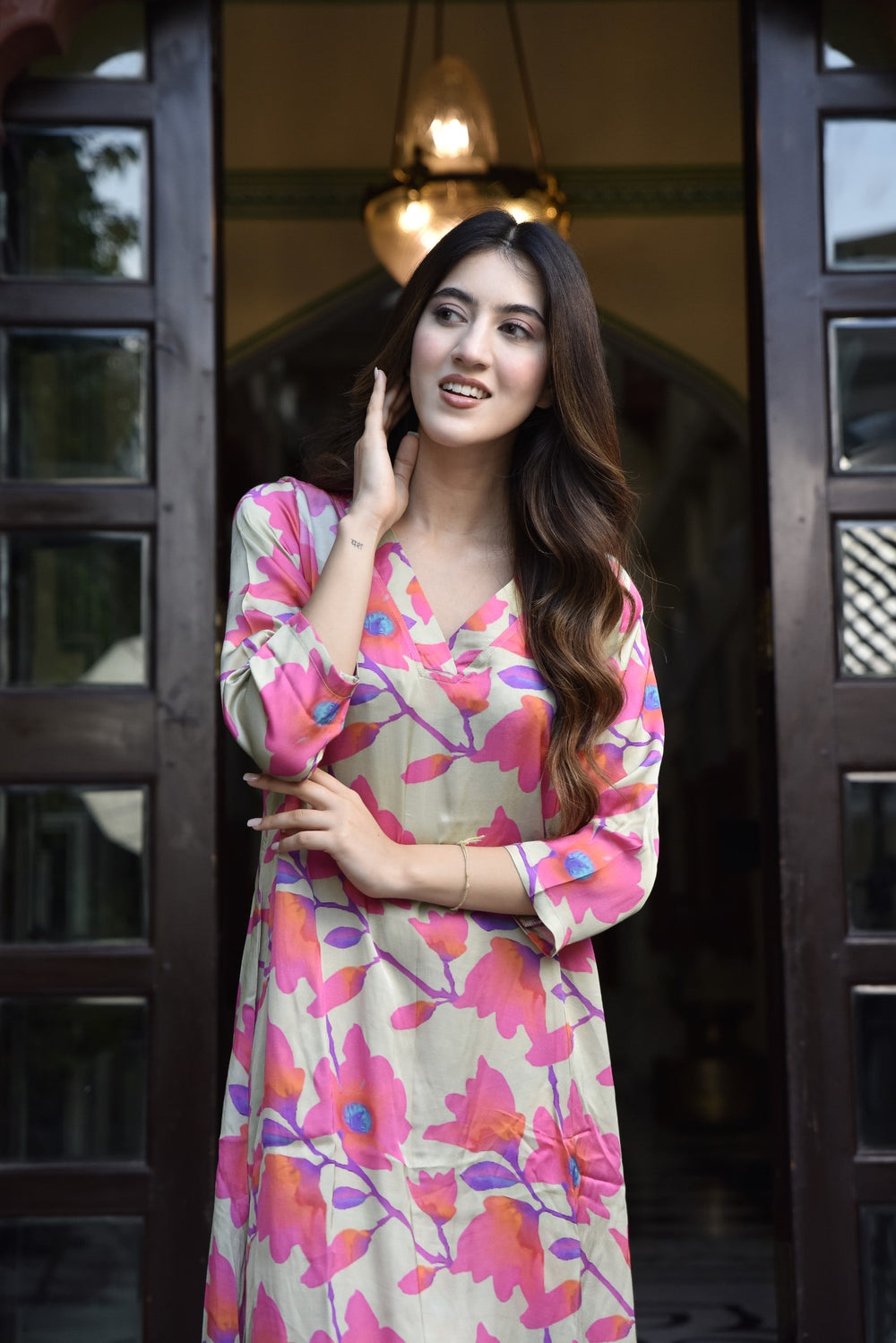 This pretty outfit is made in modal satin which is rich looking and elegant. Kurta is in A-line cut with wide leg palazzo. It has big floral motifs all over the suit set in which digital printing technique has been used. Set comes with kurta and palazzo.