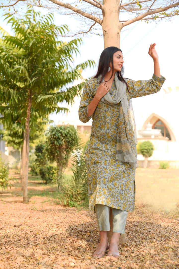 Grey kurta suit set in pure cotton is combined with chiffon dupatta. Pants are in narrow fit with a side cut.