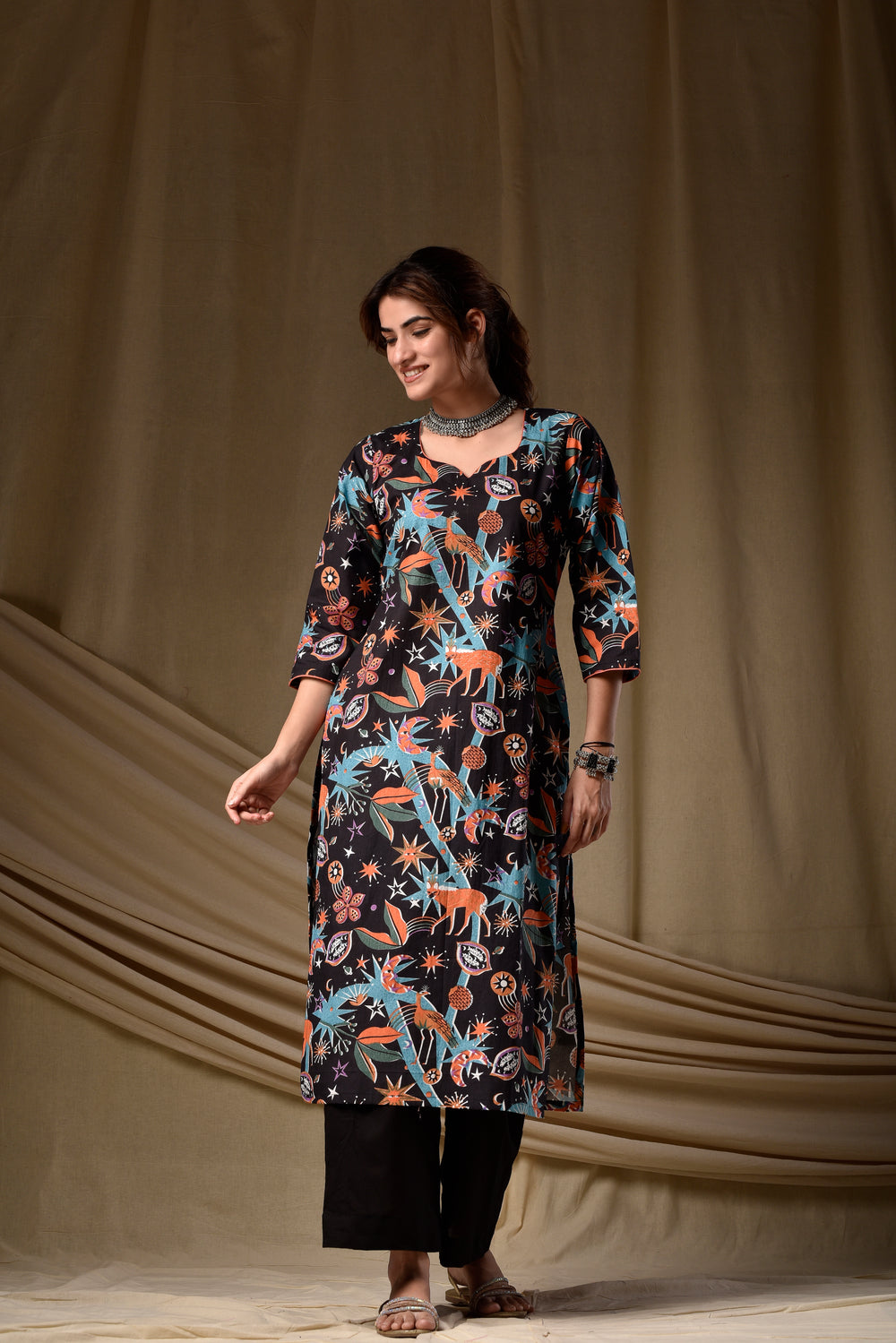 Pure cotton kurta is made in straight cut. It has abstract motifs in screen It is soft and comfortable, can be teamed up with variety of bottoms.