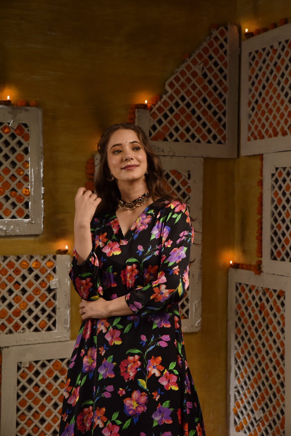 This pretty outfit is made in modal satin which is rich looking and elegant. Kurta is in A-line cut with wide leg palazzo. It has big floral motifs all over the suit set in which digital printing technique has been used. Set comes with kurta and palazzo.
