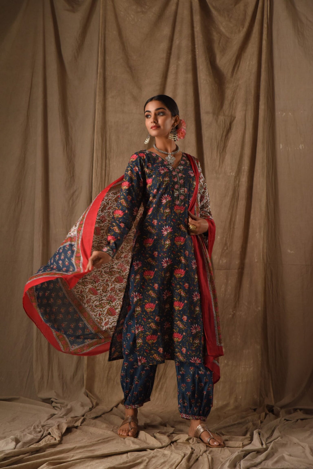 Pure cotton kurta with pleated pants is designed in handblock print. Kurta is straight with full sleeves. Dupatta is in mulmul cotton fabric.