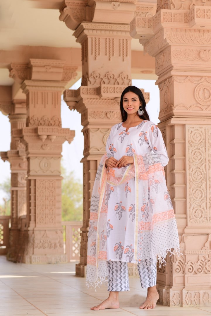 Orange Boota suit set is crafted in pure cotton on white. The print is all done by hand block printing technique of Rajasthan. Pants are in straight cut and dupatta in kota doria.
