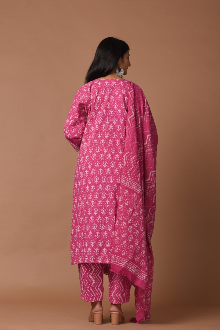 Pure cotton suit set crafted in dabu hand block printing. Pants in straight cut along with dupatta in pure cotton.