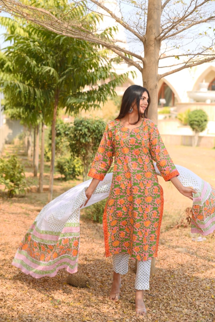 Light pink kurta set in pure cotton with cotton dupatta and pants. This beautiful suit set has green flowers made with hand block printing technique of Rajasthan.
